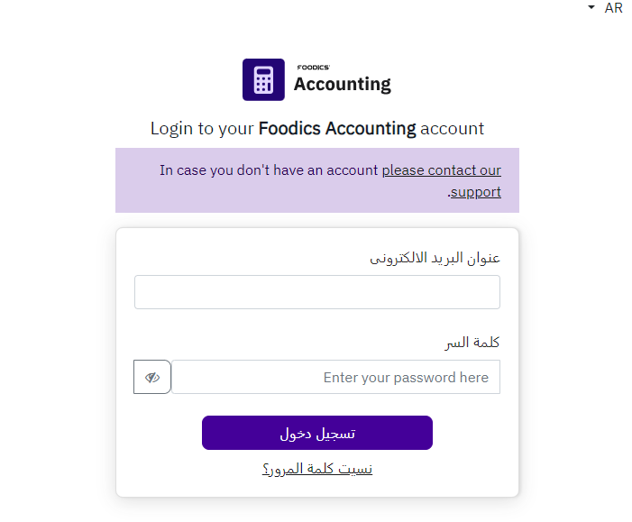 لتسجيل الدخول إلى برنامج فودكس المحاسبي، يجب عليك الانتقال إلى https://accounting.foodics.com/login ومن ثم تسجيل الدخول باستخدام تفاصيل الدخول الخاصة بك.