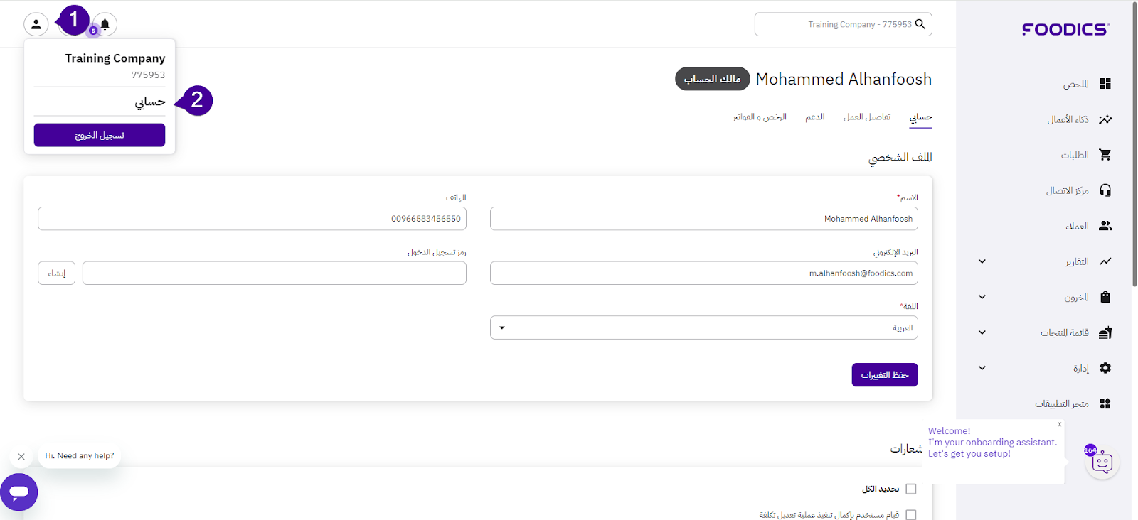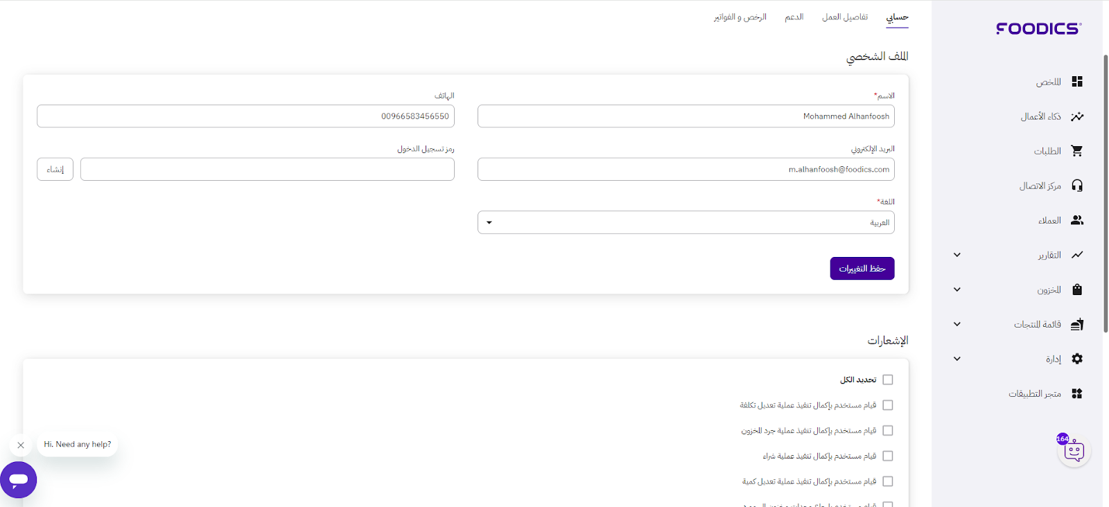 ضمن علامة "حسابي"، لديك مرونة في تحديث التفاصيل الأساسية مثل رقم الجوال والبريد الإلكتروني، وكلمة مرور الدخول للكاشير. بالإضافة إلى ذلك، يمكنك تخصيص اللغة لكل من لوحةالتحكم والكاشير، بالإضافة إلى اختيار إعدادات الإشعارات المفضلة لتلقيها عبر البريد الإلكتروني.
