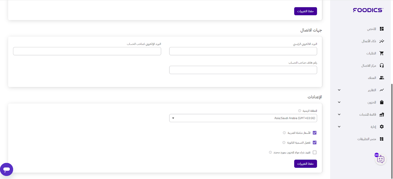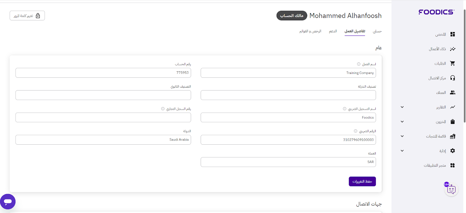 انتقل إلى علامة "تفاصيل العمل" لإجراء تعديلات على اسم عملك، واسم ورقم السجل التجاري، بالإضافة إلى الرقم الضريبي. في قسم الإعدادات، يمكنك تحديد المنطقة الزمنية، وتحديد ما إذا كانت الأسعار شاملة للضريبة، وتفعيل التسمية الثانوية، وتقييد شراء مواد المخزون بمورد محدد.
