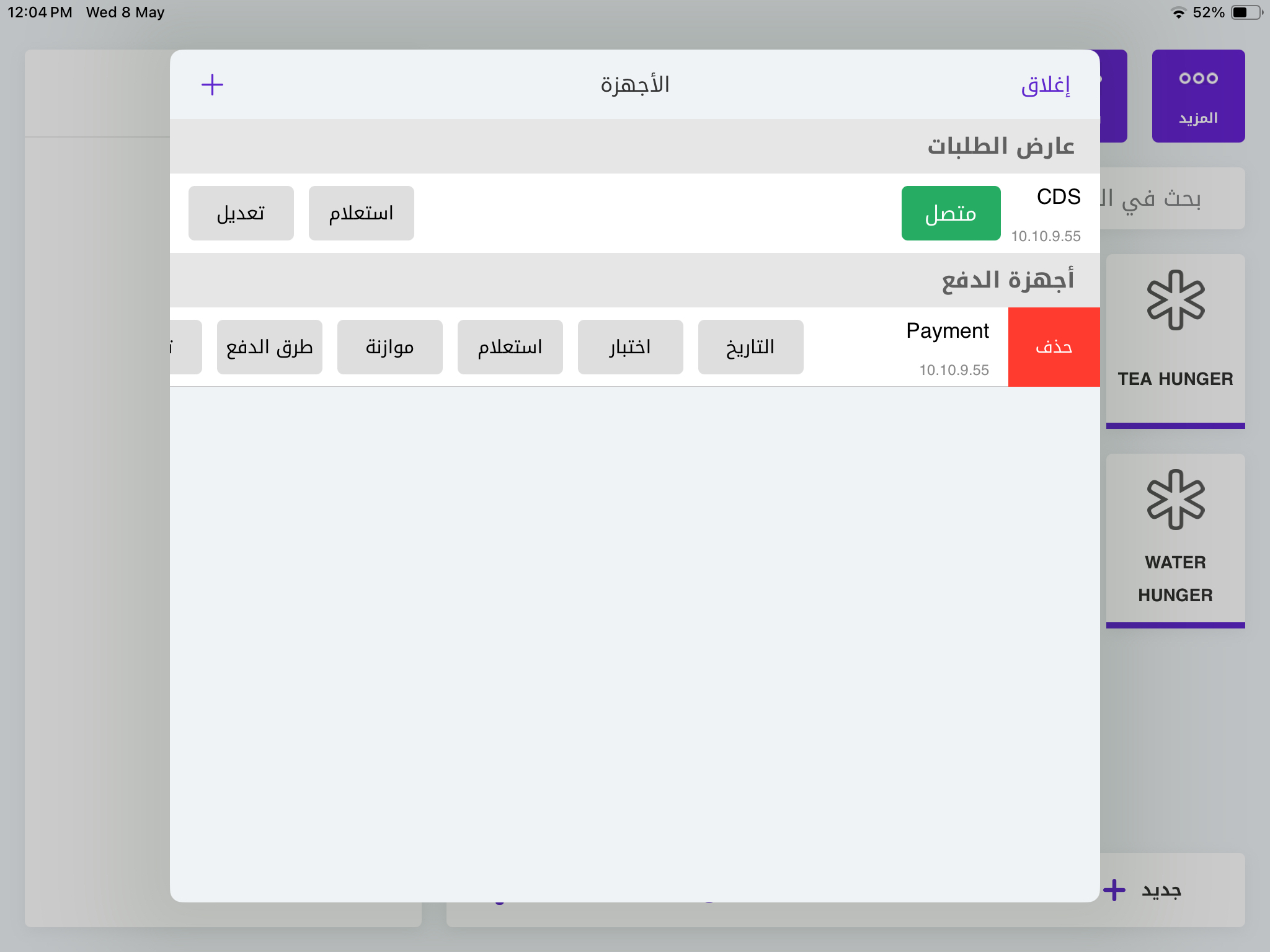 1. تأكد من أن تطبيق الكاشير متصل بشكل صحيح بجهاز عارض الطلبات الاندرويد. اذهب إلى تطبيق الكاشير، واختر "الكاشير" > "الرئيسية" > "الأجهزة"، وتحقق من أن عنوان الايبي مدرج كشاشة عرض وكذلك كجهاز دفع. ثم، قم بعمل استعلام لكليهما للتأكد من اتصالهما.