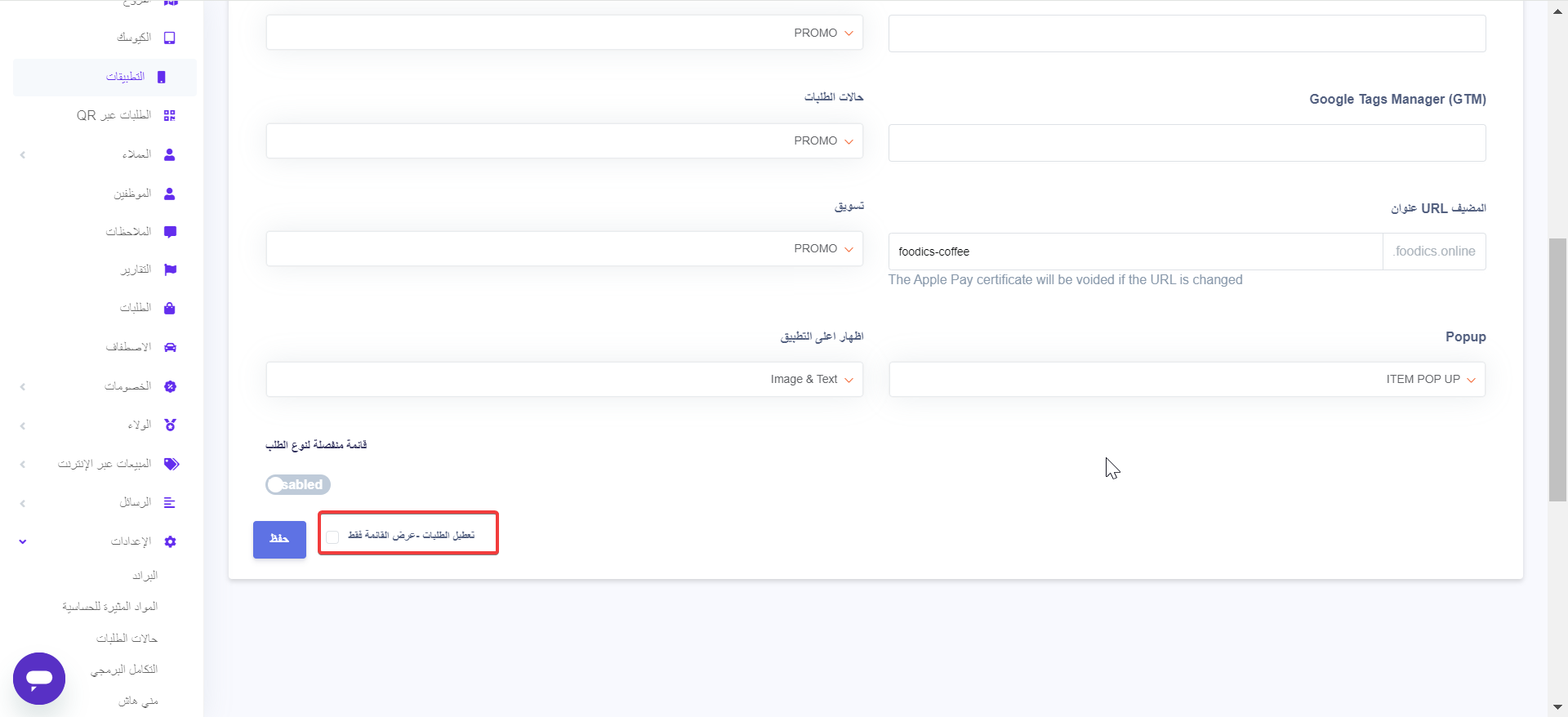 التطبيقات - عرض التطبيق - قم بإلغاء تحديد خيار "تعطيل الطلبات - عرض القائمة فقط"