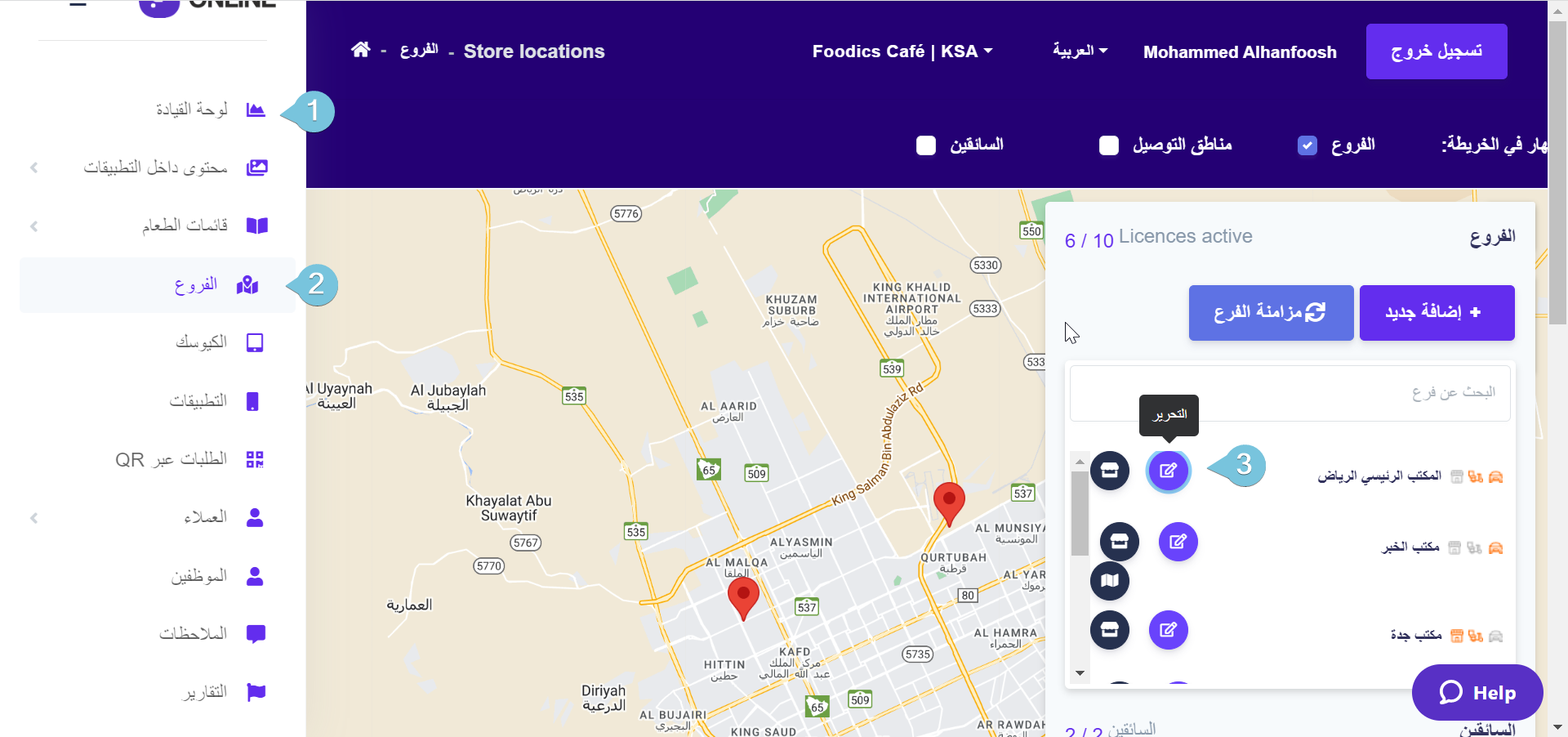 مقالات ذات صلة كيفية انشاء رمز باركود للطلب فودكس اونلاين تعديل الفروع كيفية القيام بنهاية اليوم قراءة العمليات كيفية تفعيل جهاز فودكس ون مقالات مرقاة الدليل المتكامل لتقارير الكونسول الدليل المتكامل للقائمة و المنتجات الدليل المتكامل للمخزون الدليل المتكامل لإعدادات الكونسول و النظام كيفية تغيير ساعات عمل الفرع في فودكس اونلاين 14 مارس، 2024 11:41 محدَّث لتغيير اوقات عمل فرعك في فودكس اونلاين اتبع الخطوات التالية: 1- إضغط لوحة القيادة. 2- إضغط الفروع. 3- إضغط أيقونة تحرير الفرع. السابق التالي 13075506914460