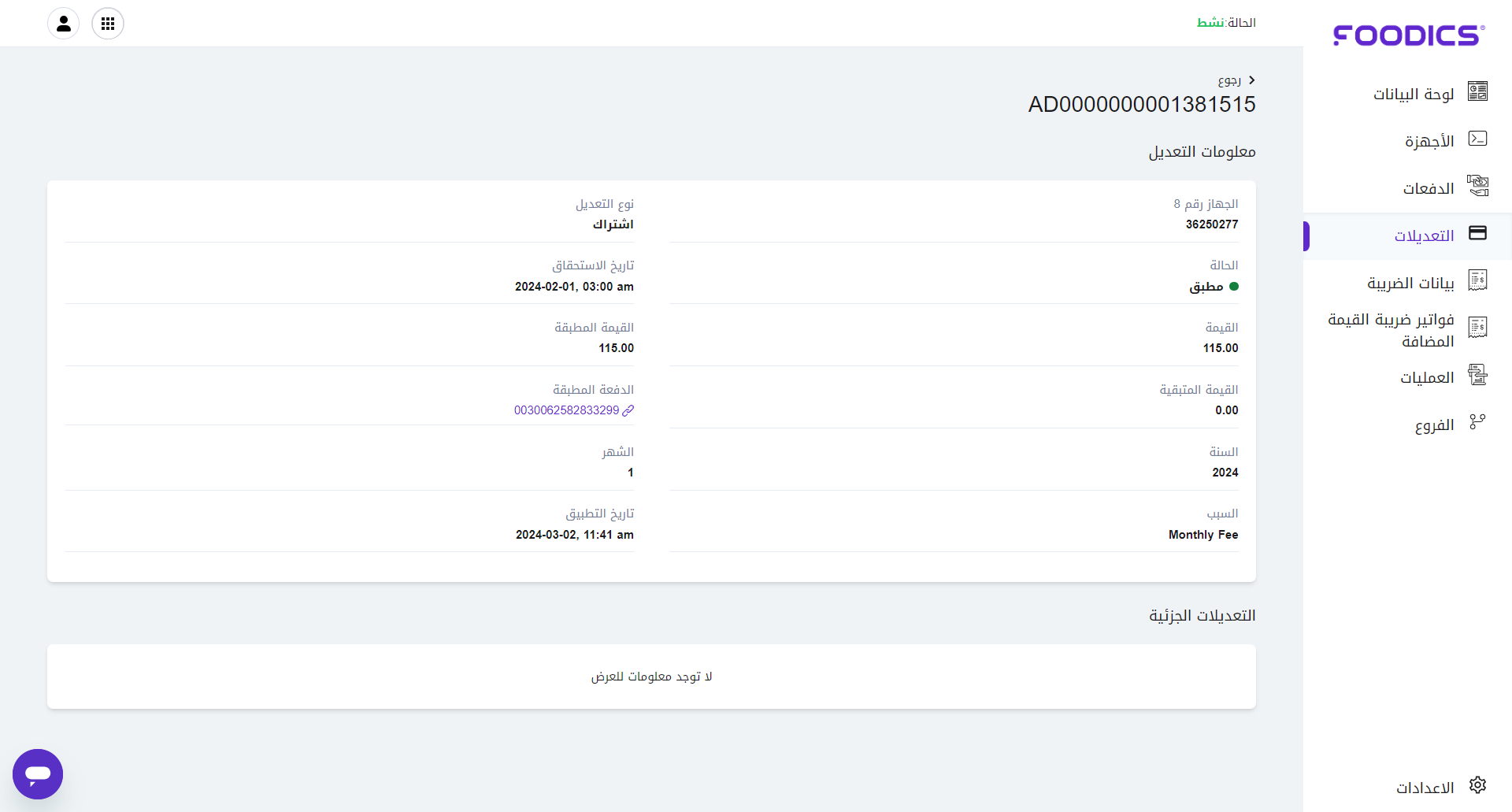 - تم الإنشاء: تشير إلى تاريخ إنشاء وإعداد التعديل من قبل فودكس.