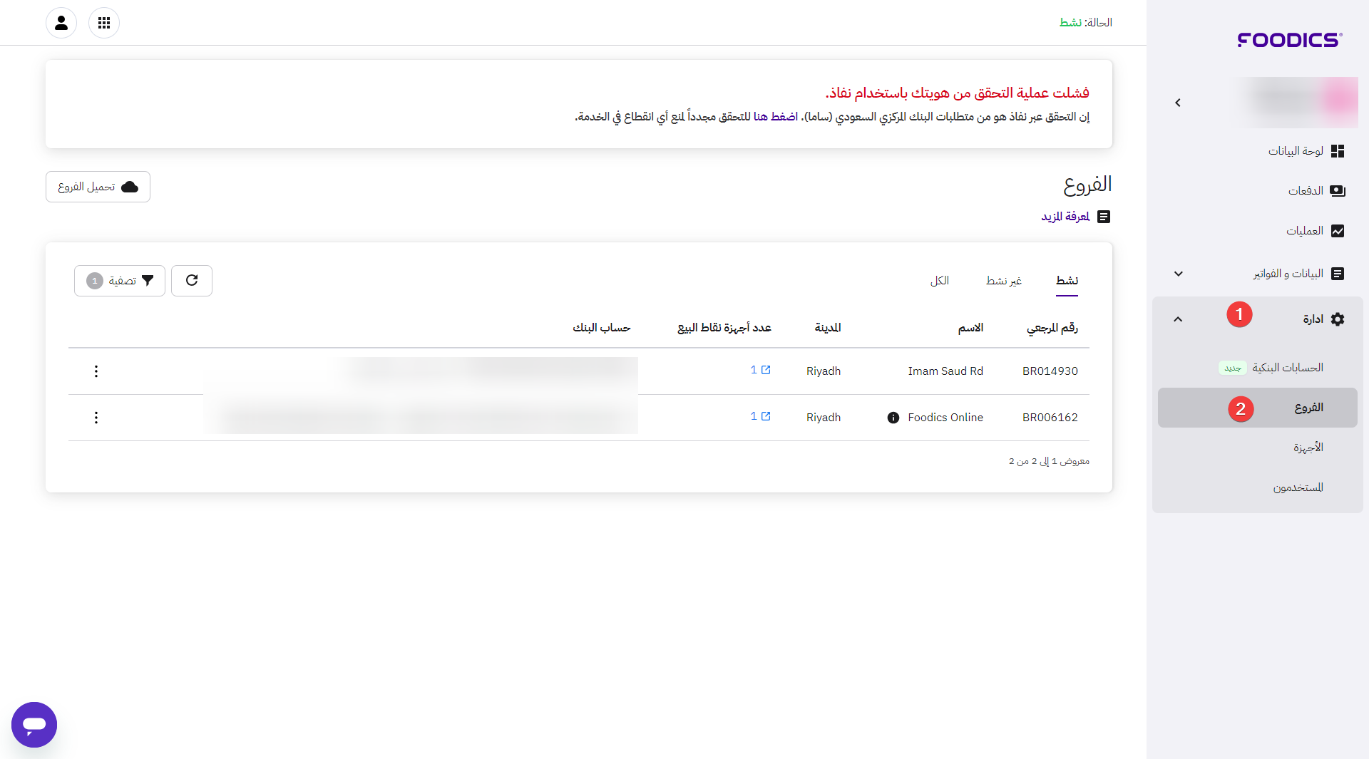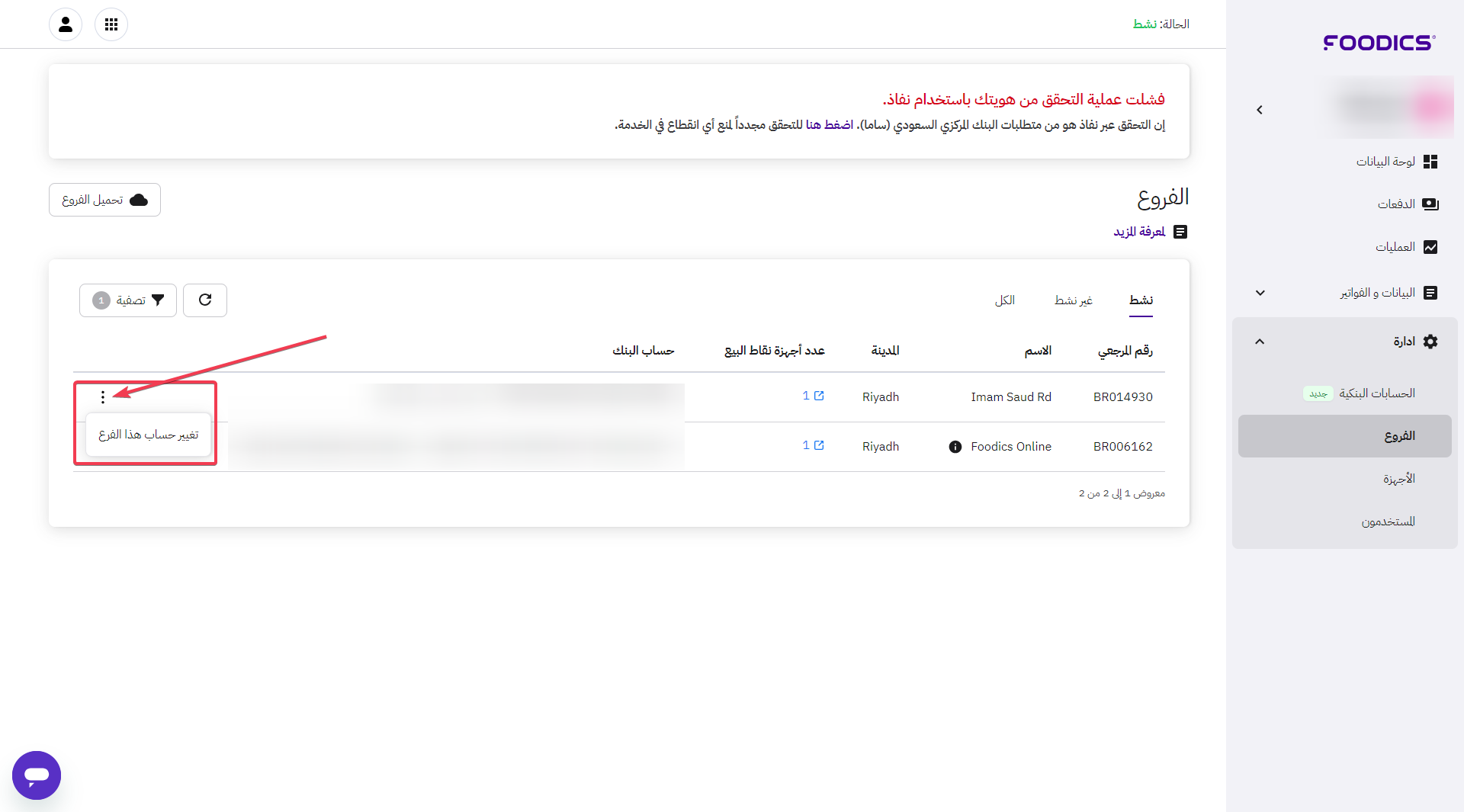 إذا تم الموافقة على الآيبان وترغب في تغييره، يمكنك القيام بذلك على مستوى الفرع، حيث تحتاج إلى الدخول إلى صفحة الفروع.
