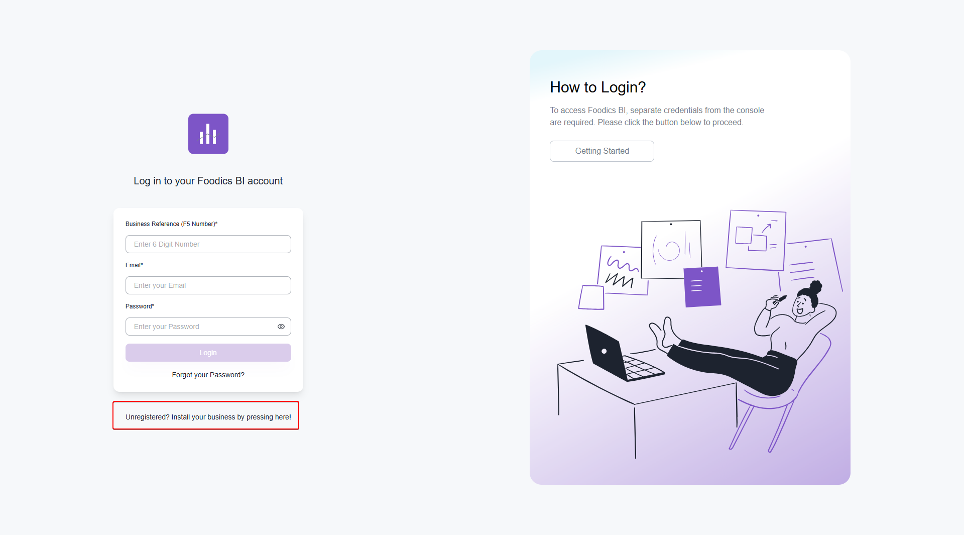 "Unregistered? Install your business by pressing here!" اضغط عليه.