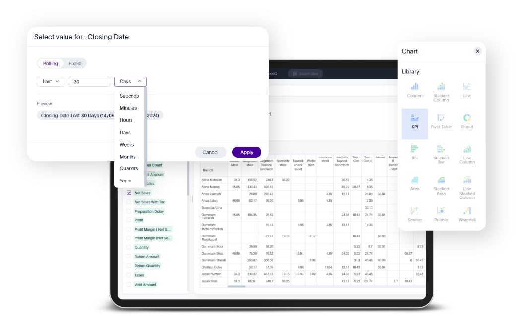 العرض الديناميكي للبيانات: اعرض البيانات في الزمن الحقيقي مع إمكانية التعمق في التفاصيل، وتطبيق الفلاتر، والتحليل الفوري، لتعزيز المناقشات الهادفة واتخاذ القرارات بسرعة وكفاءة.