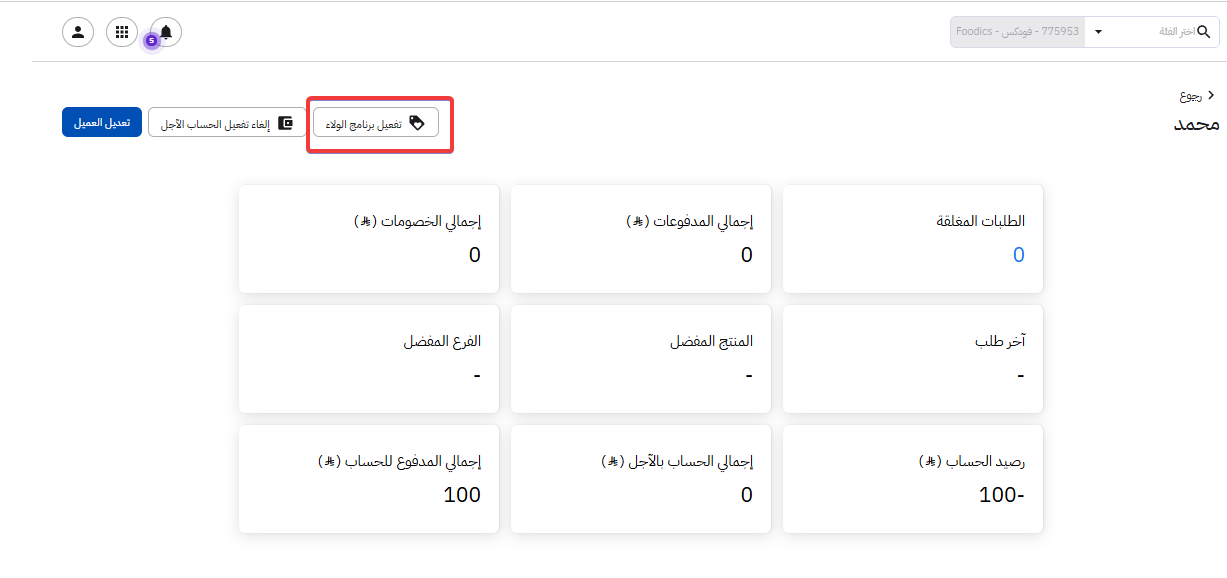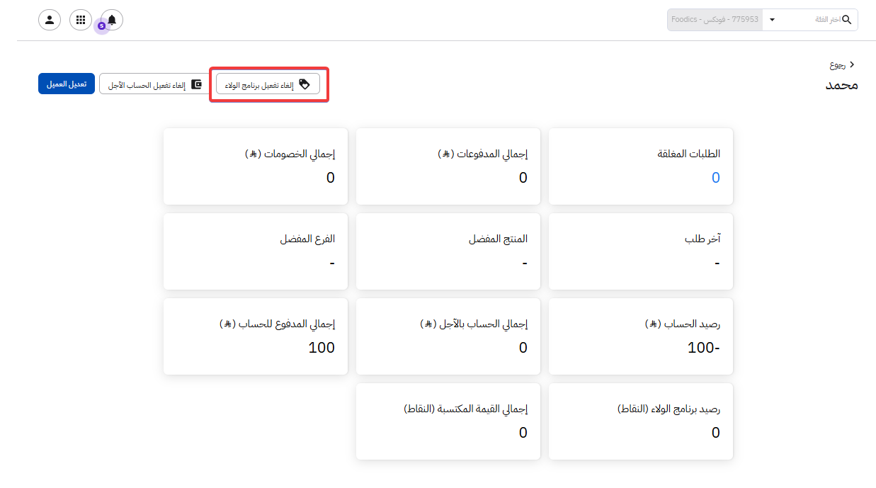6. ولتعطيل الولاء، تقدر تستخدم نفس الزر اللي في أعلى صفحة ملف العميل.