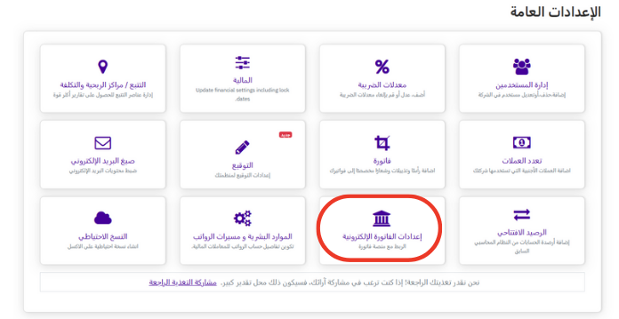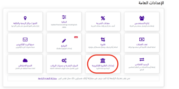 من فودكس المحاسبي ادخل على: الإعدادات > إعداد فاتورة الإلكترونية