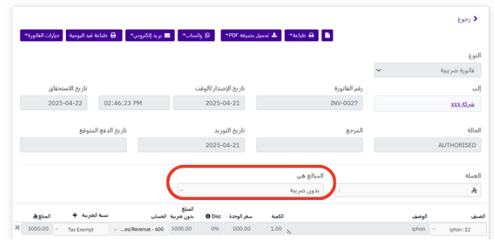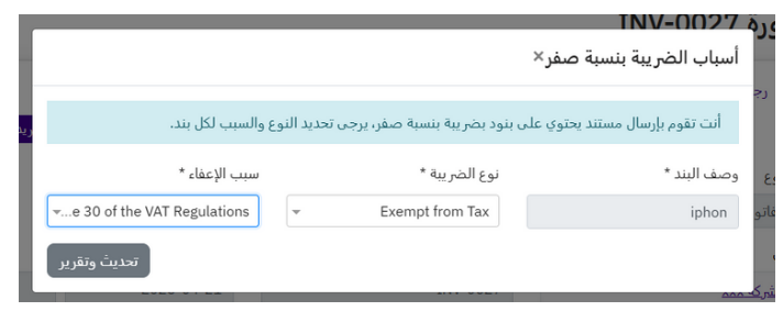 لو اخترت (بدون ضريبة / No Tax) في خانة المبلغ، لازم تدخل سبب خضوعه لضريبة صفرية عند إرسال الفاتورة للهيئة.