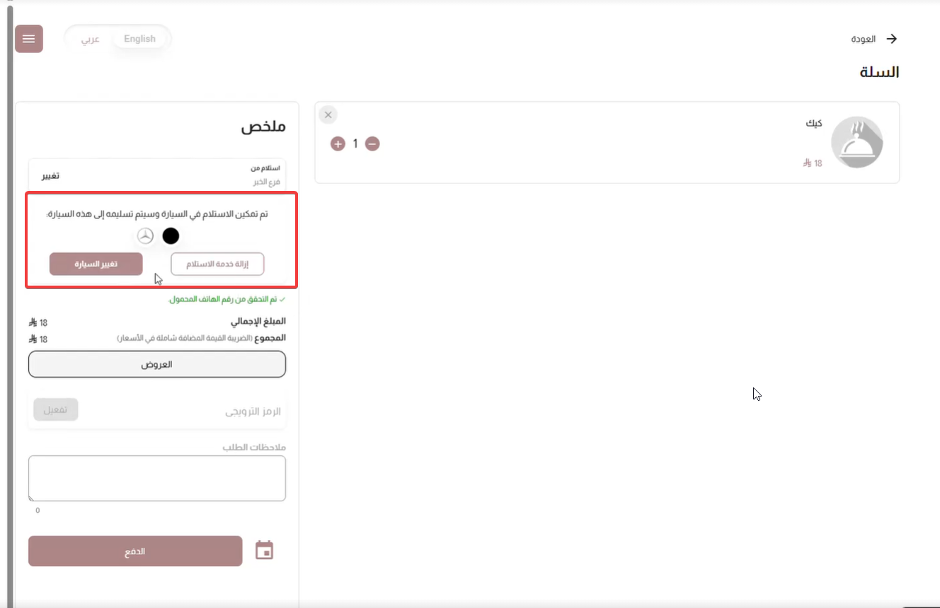 يظهر فقط مع الاستلام: خيار Curbside يكون مرئيًا فقط عندما يختار العميل نوع الطلب "استلام".