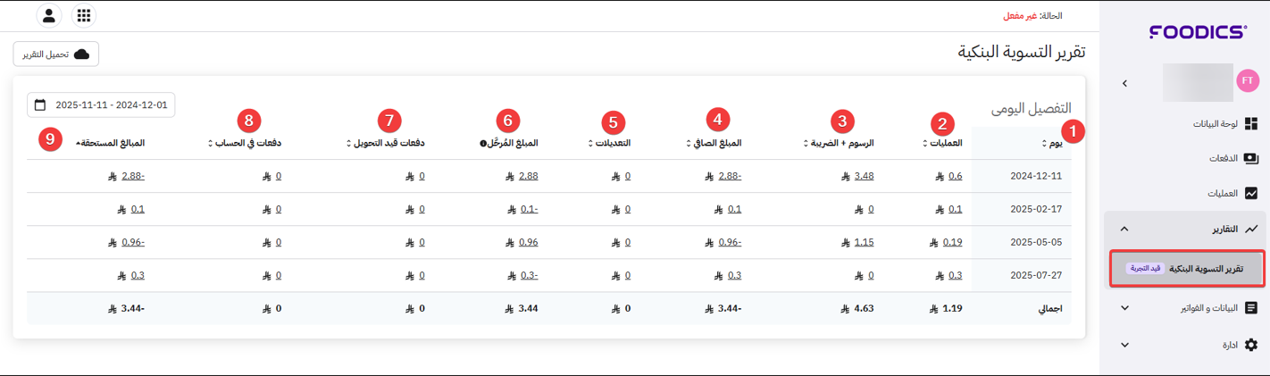 تقرير التسوية البنكية يساعدك على تتبع جميع المعاملات المالية اليومية والتحقق من حالتها الحالية. يتيح لك التأكد مما إذا كانت المعاملات لكل يوم محدد قد تم استلامها، أو لا تزال قيد الانتظار، أو تحتوي على مبالغ متبقية لم يتم تحويلها إلى حسابك بعد. كما يقدم ملخصًا مفصلًا للمعاملات والرسوم والتعديلات والمدفوعات خلال فترة زمنية محددة.