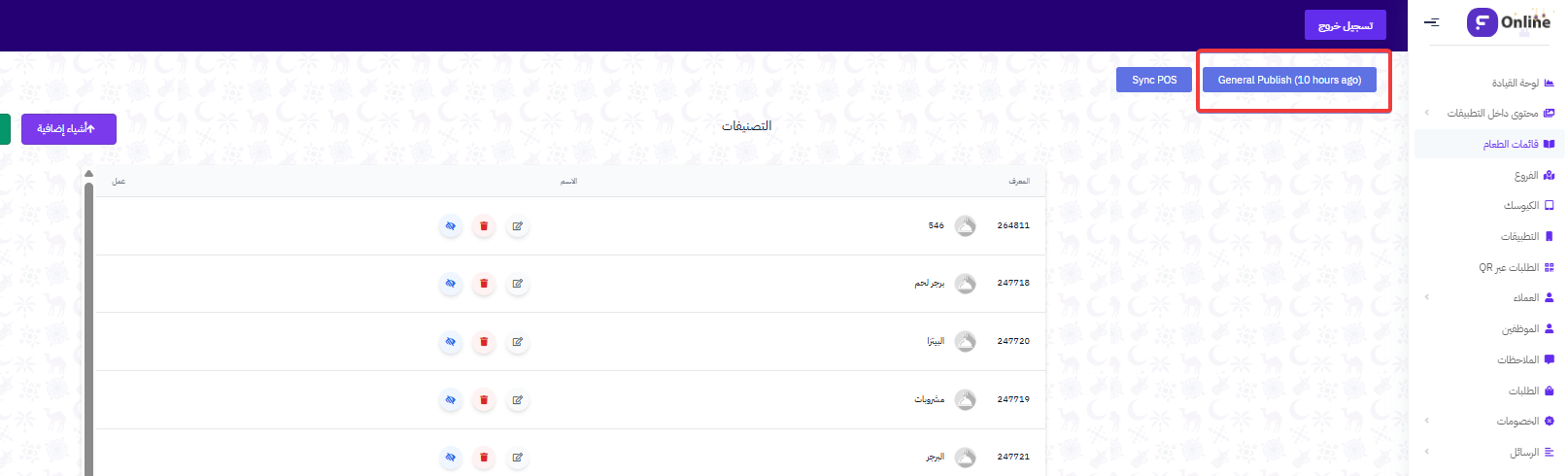 بعد النقر على (General Publish) ، سيتم تطبيق جميع التحديثات الأخيرة على القائمة لتظهر في التطبيقات ومنصة الويب.