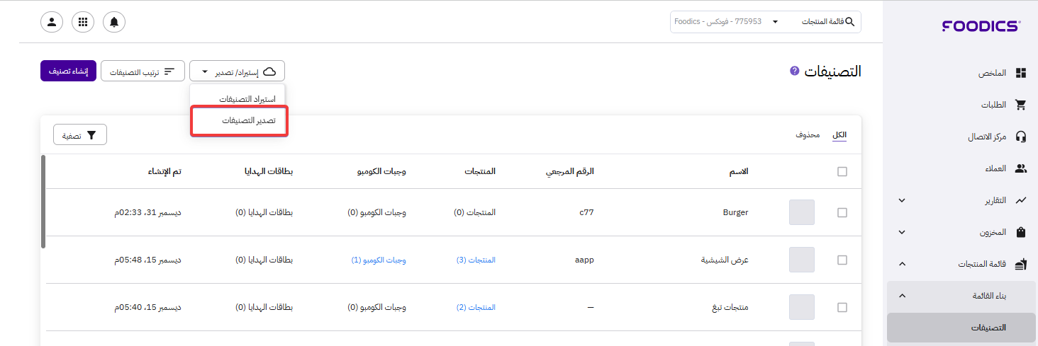 ذا أردت تعديل عدد كبير من التّصنيفات في آنٍ واحد، يمكنك تحميل لائحة التّصنيفات (ملف CVS) إلى حاسوبك وإجراء التعديلات المطلوبة، ثمّ إعادة تحميلها إلى النّظام. وهكذا لا تضطر إلى تعديل كل تصنيف بمفرده من خلال النّظام. لتحميل الملف: