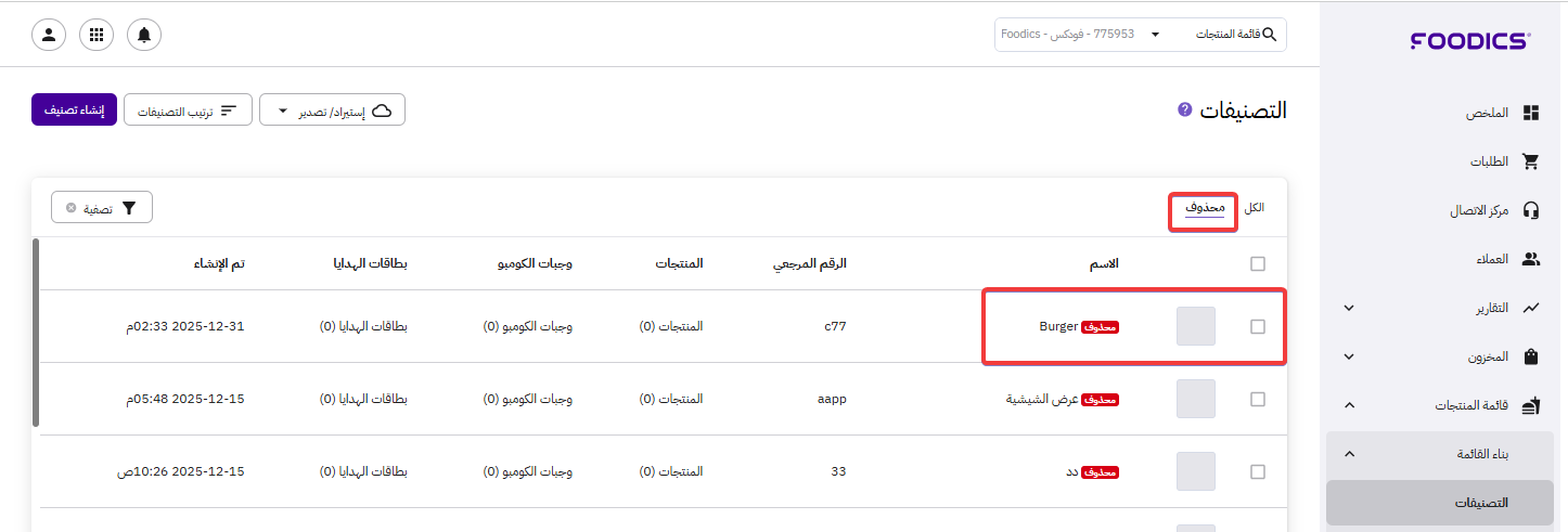 بعد أن يتمّ حذف التصنيف، سينتقل من صفحة الكل إلى صفحة محذوف كما يظهر أدناه: