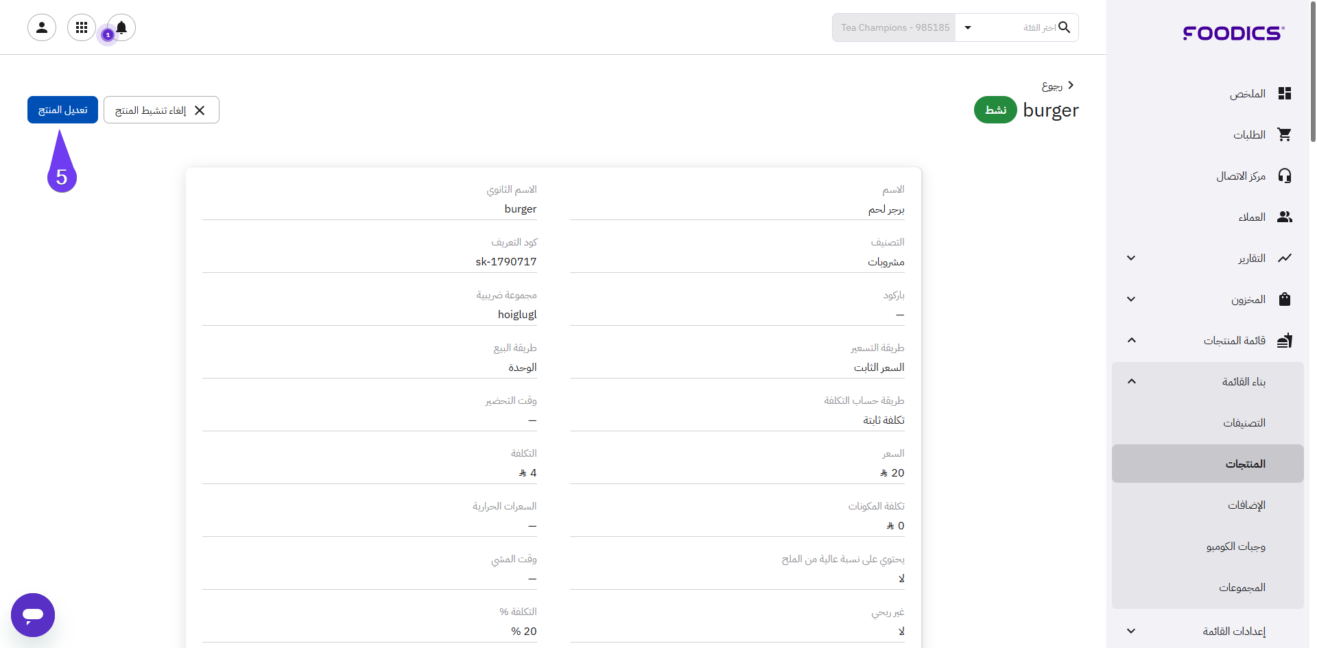 - وقت التحضير (دقيقة): الفترة التي يحتاجها موظفو المطبخ لتحضير المنتج (ملاحظة: تقارير سرعة الخدمة. تعتمد على هذه المعلومة)