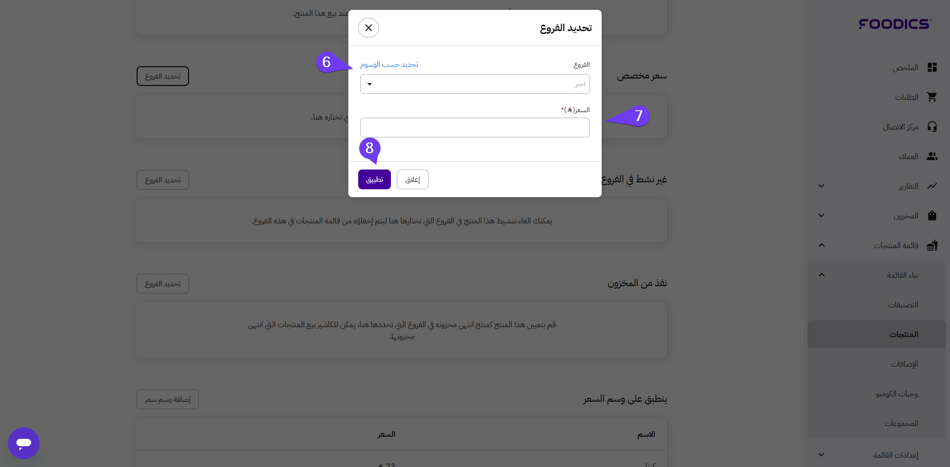 6. ستظهر نافذة حيث يمكنك اختيار الفروع وتحديد أسعار مختلفة لمنتجاتك.