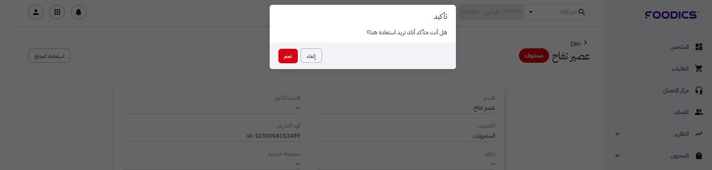 7. ستظهر نافذة لتأكيد استعادة المنتج. انقر على نعم.