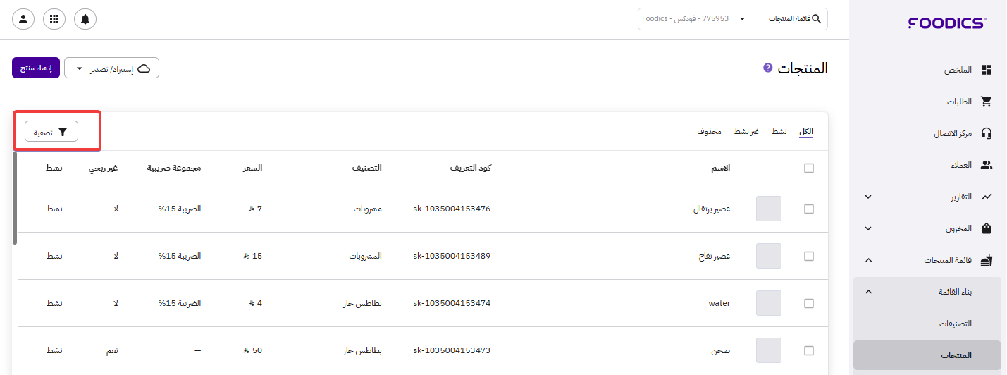 4. انقر على تصفية في أعلى صفحة المنتجات.