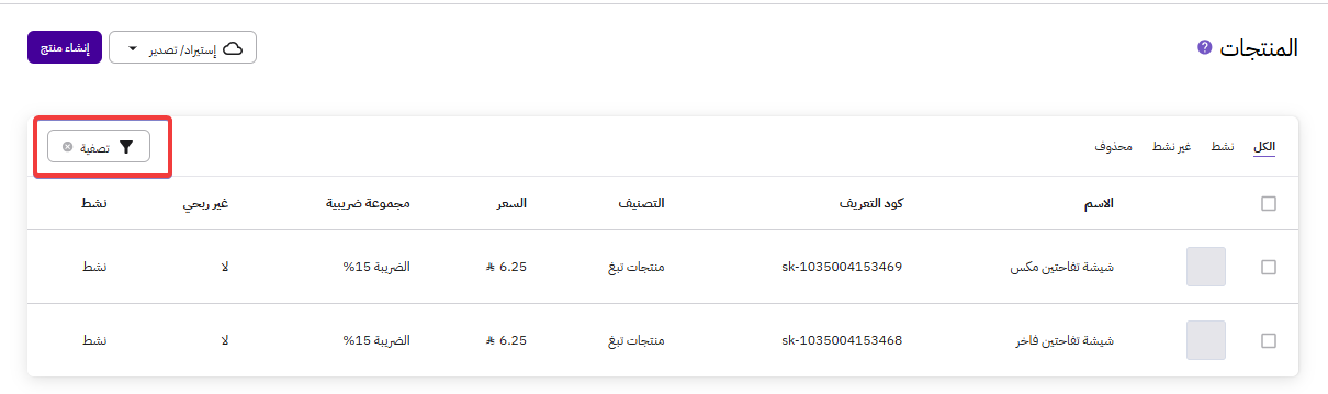 - نشط: إذا كان المنتج نشط (نعم أو لا).