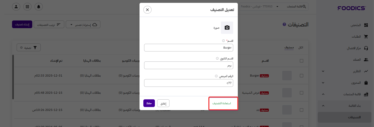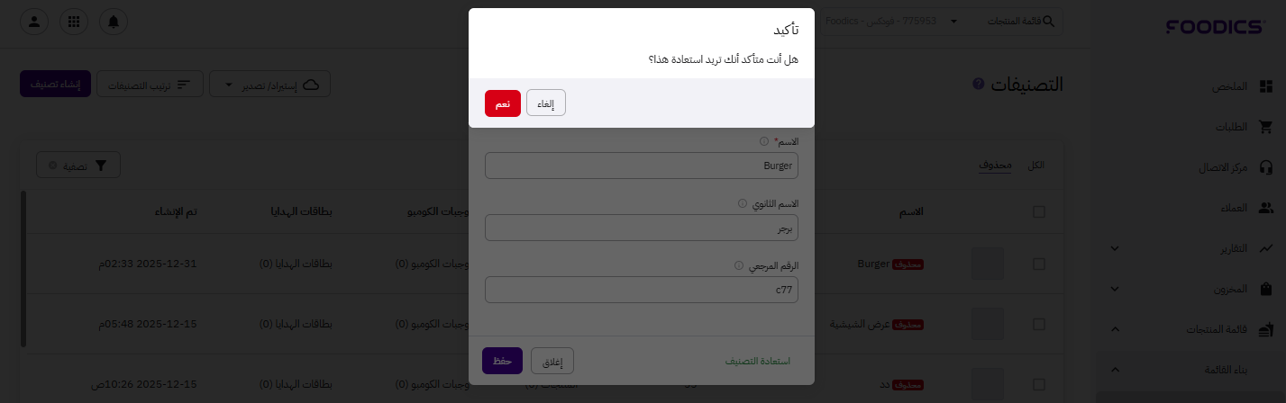 قائمة المنتجات: استعادة التّصنيفات المحذوفة.