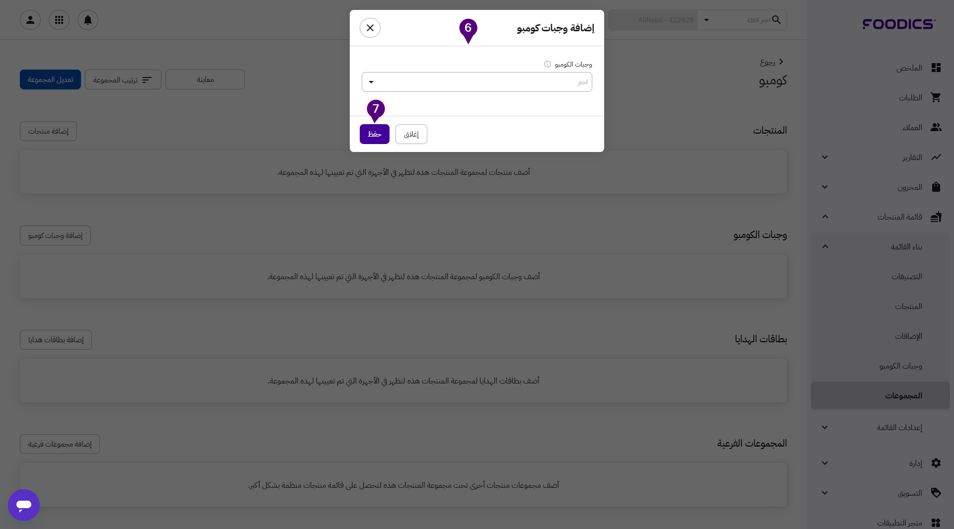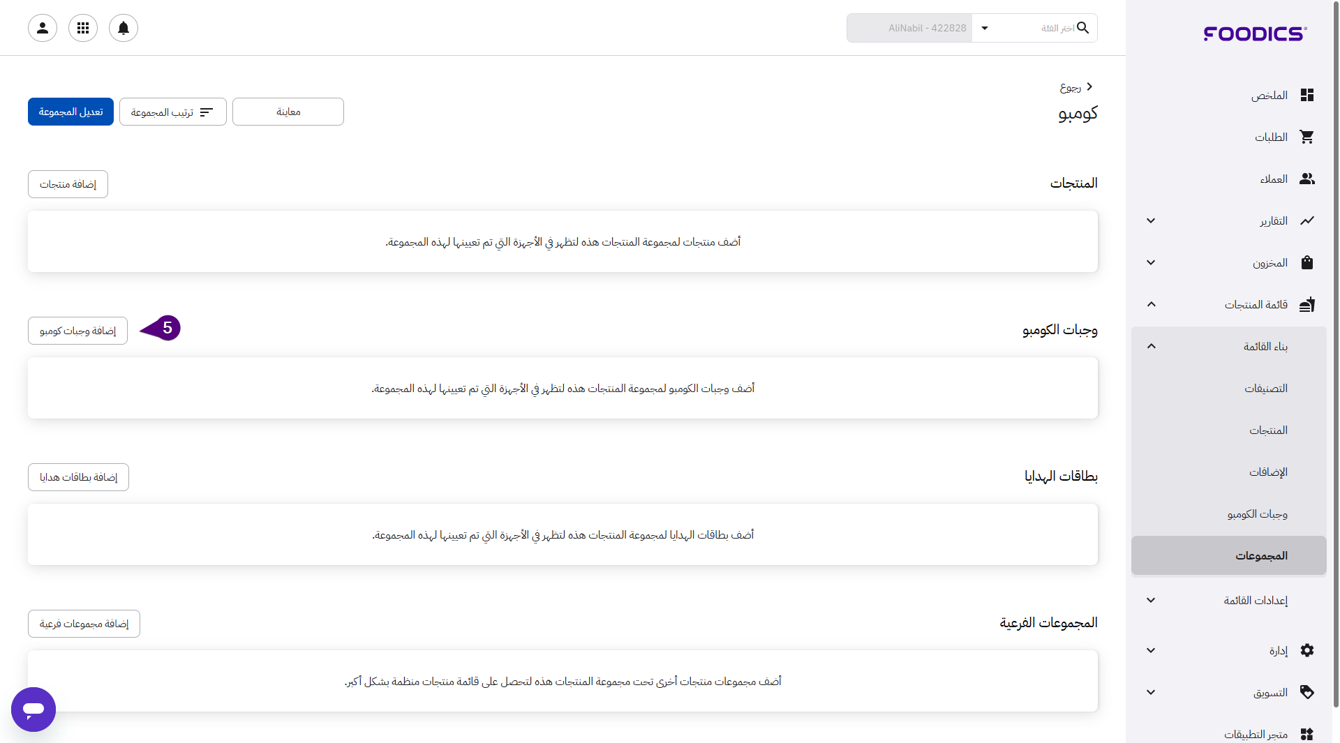 4. انقر على المجموعة التي تريد إضافة وجبة كومبو إليها.