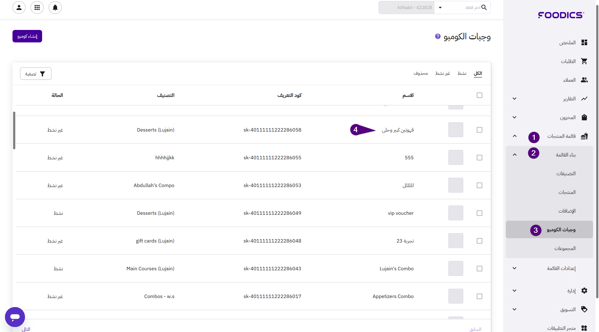 تنشيط وإلغاء تنشيط وجبات الكومبو
