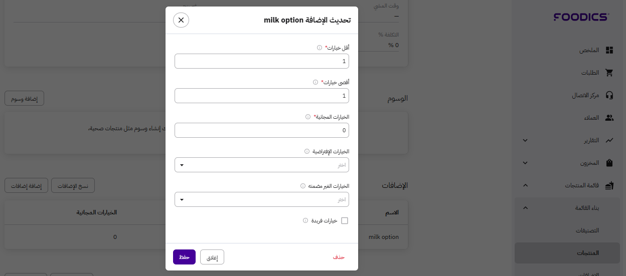 - الخيارات المجانية: الكمية المسموحة من الخيارات المجانية قبل فرض سعر. مثلًا، يمكنن حصر الكمية المجانية بإضافتين، وإذا قرر الزبون اختيار 4 إضافات، يحصل على 2 مجانًا ويدفع ثمن 2.