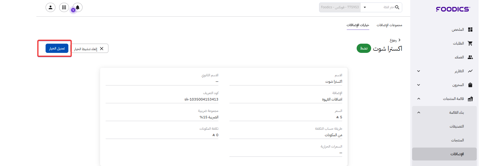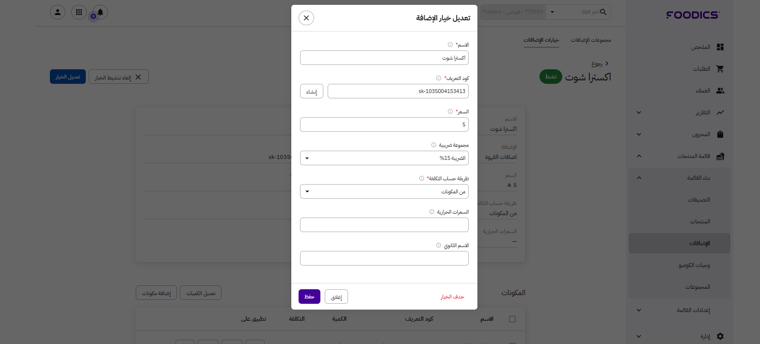 تعديل خيارات الإضافات