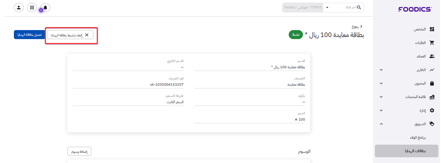 4. انقر على إلغاء تنشيط بطاقة الهدايا في أعلى الصّفحة جهة اليسار.