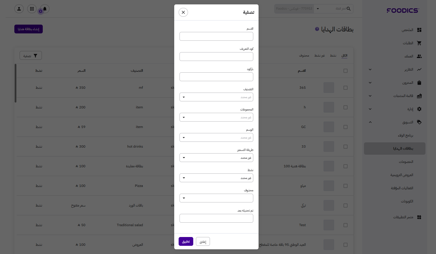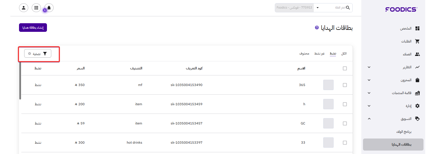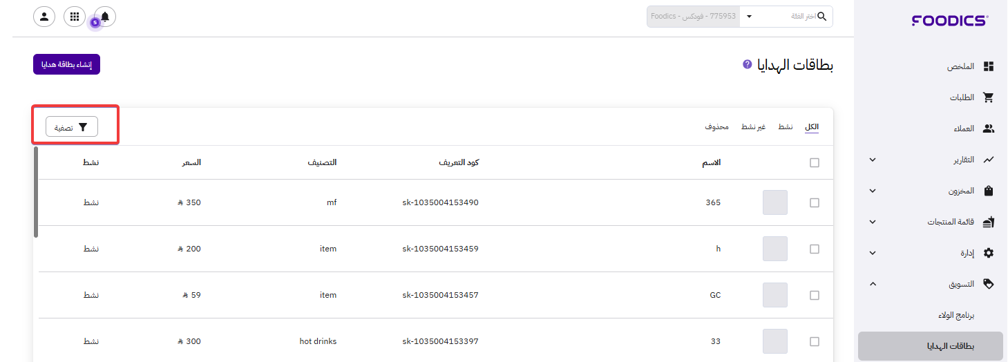 يمكنك تصفية بطاقات الهدايا بحسب بعض المعايير، لتتمكن من الوصول إلى البطاقة التي تبحث عنها.