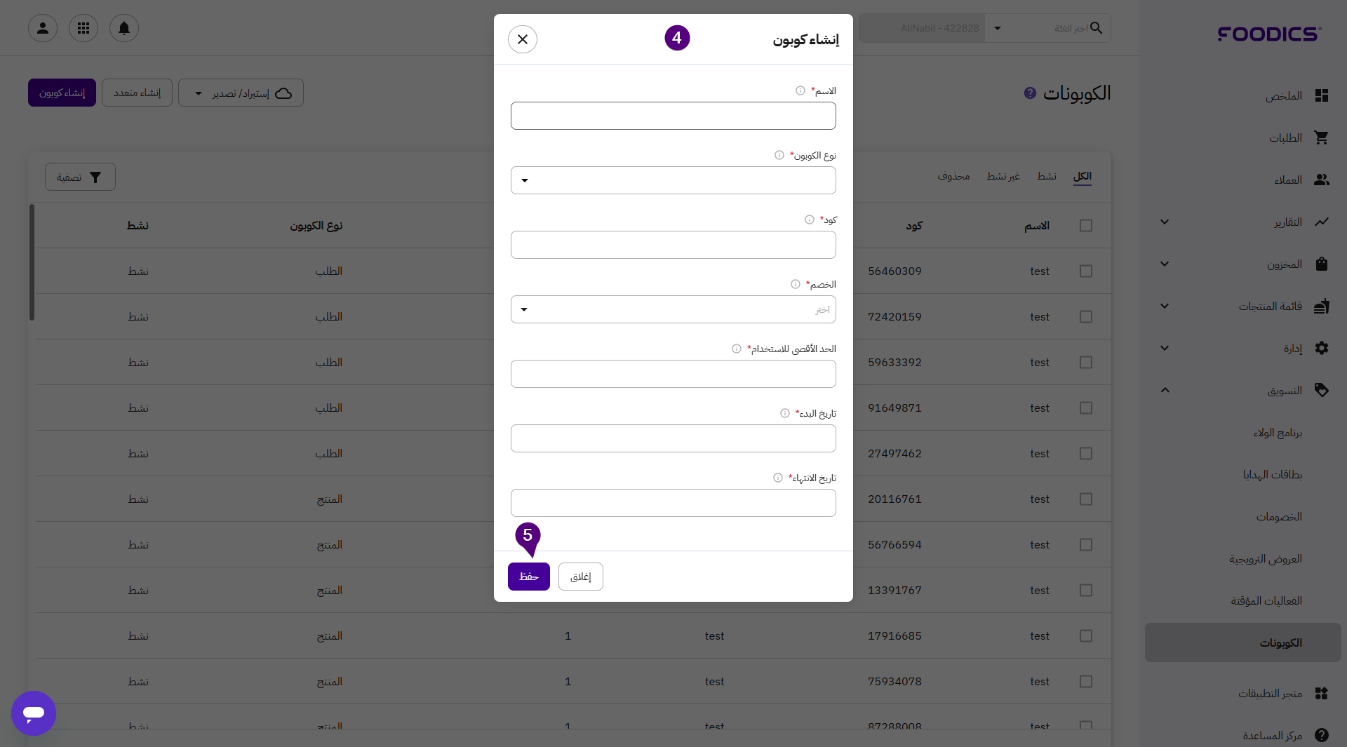 - الاسم (بند إلزامي): ادخل اسم الكوبون الجديد.