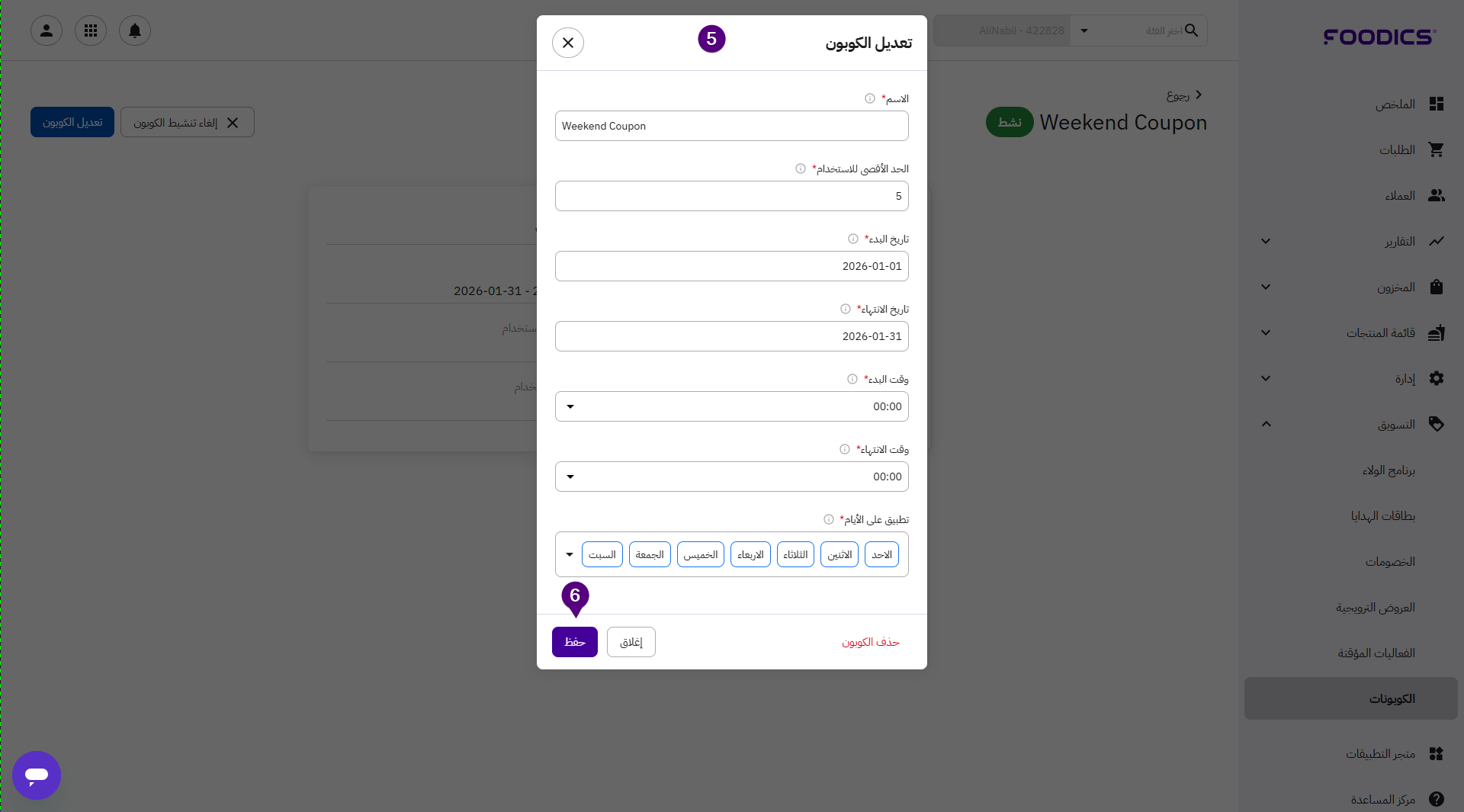 - تطبيق على الأيام (بند إلزامي): حدد الأيام التي يمكن استخدام الكوبون فيها.