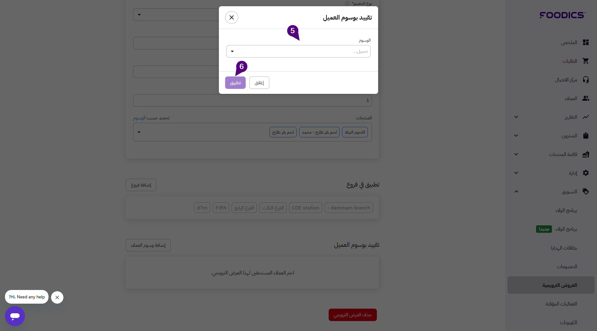 5. ستظهر نافذة حيث يمكنك إضافة وسوم العملاء الذين يمكنهم الاستفادة من العرض الترويجي.