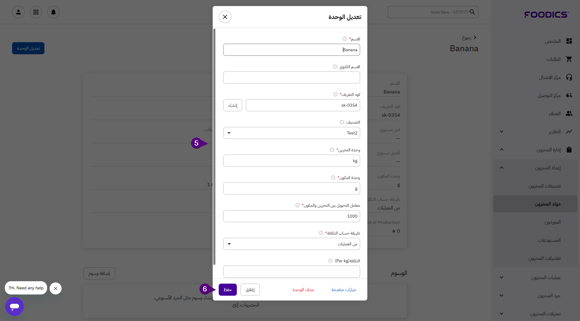 - معامل التحويل بين التخزين والوصفة (بند إلزامي): حدد كمية وحدة الوصفة داخل وحدة المخزون الواحدة (مثلًا: 1000 في حال كانت وحدة التخزين كيلو جرام ووحدة الوصفة جرام).