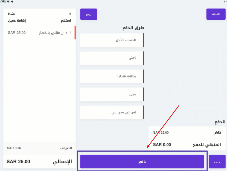 - من شاشة الكاشير، اضغط الطلبات (Orders)