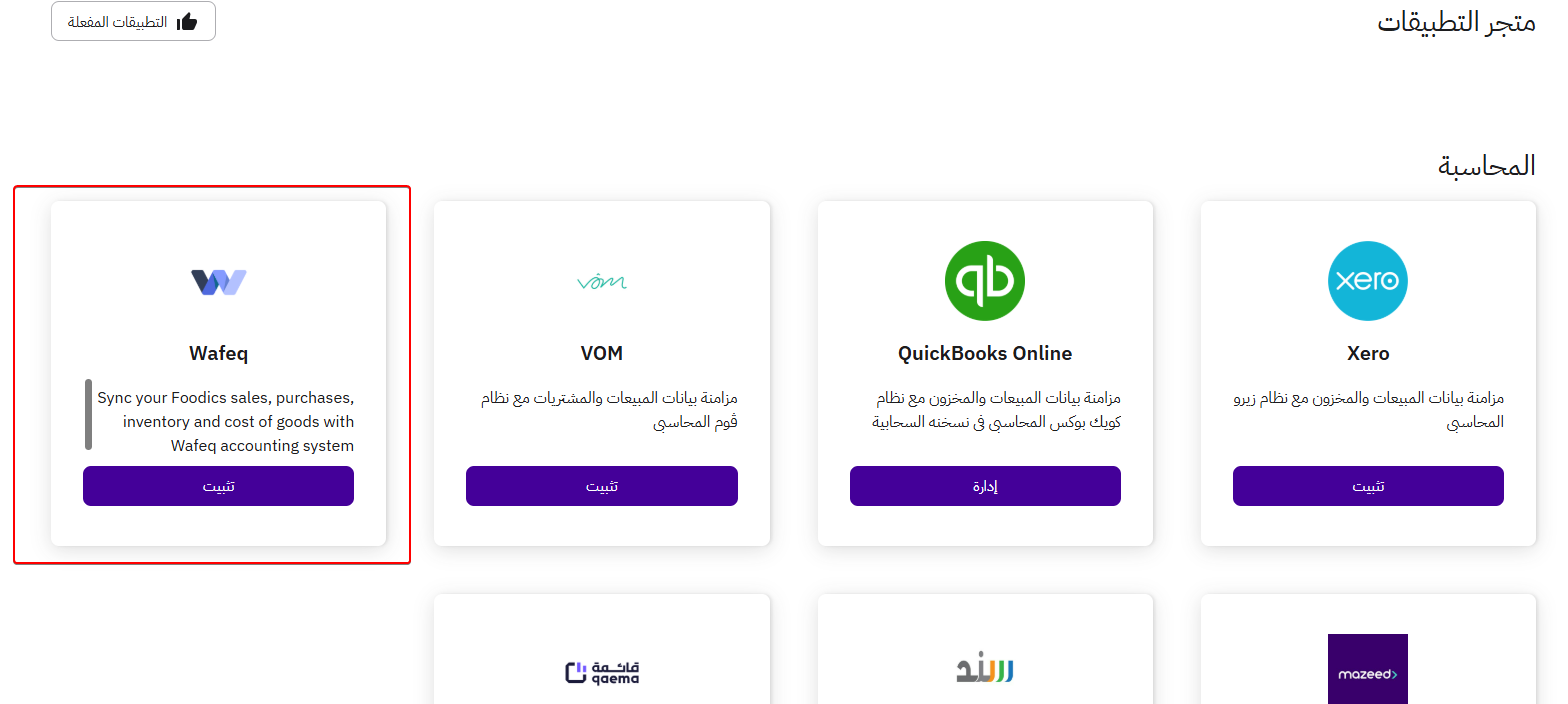 ملاحظة: إذا دخلت بحساب غير مالك، فلن تتمكن من تفعيل التكامل. - انتقل إلى صفحة السوق (Marketplace) --> ابحث عن وافق (Wafeq) تحت فئة المحاسبة (Accounting) --> اضغط تثبيت (Install).