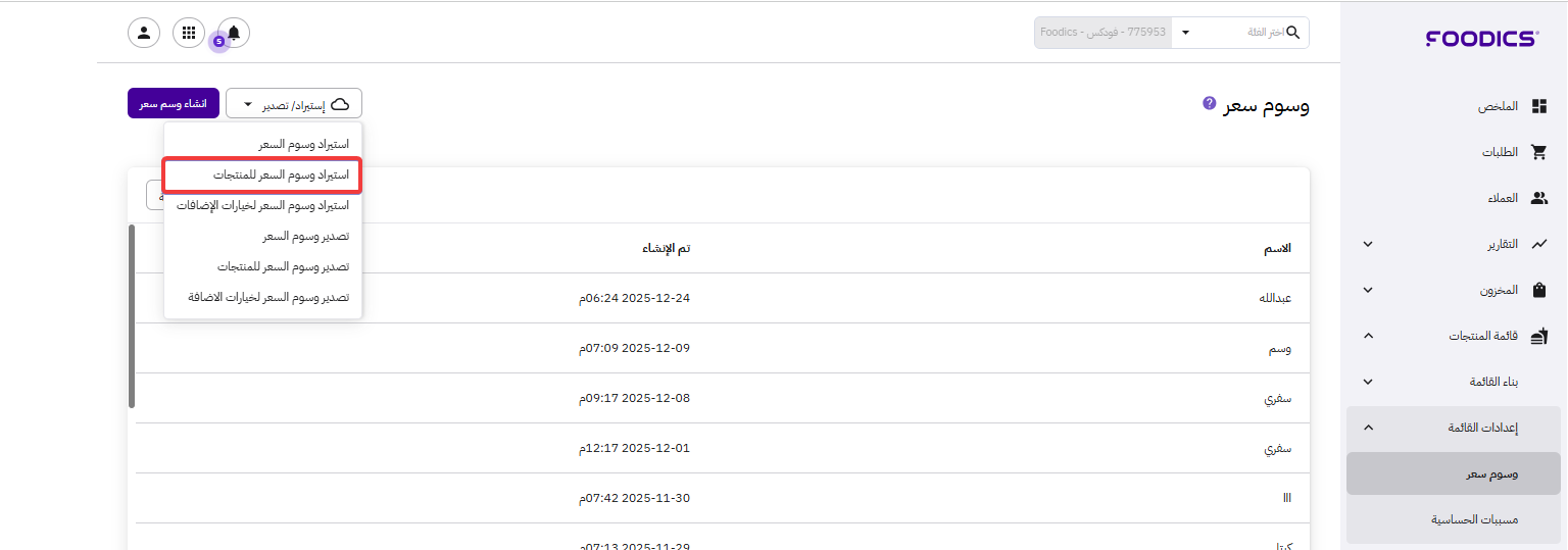 2. اضغط على استيراد وسوم السعر للمنتجات