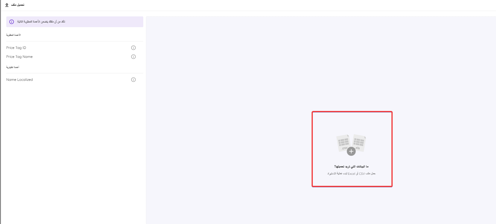 إذا أردت إضافة عدد كبير من المنتجات على وسوم الأسعار، يمكنك تحميل القالب الخاص بذلك (ملف CVS) إلى حاسوبك وإضافة المعلومات المطلوبة، ثمّ إعادة تحميلها إلى النّظام. وذلك بدلا القيام بذلك في النظام بشكل يدوي.