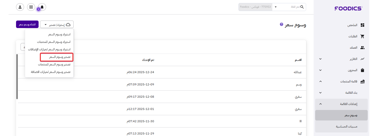 5. اضغط على تصدير وسوم السعر