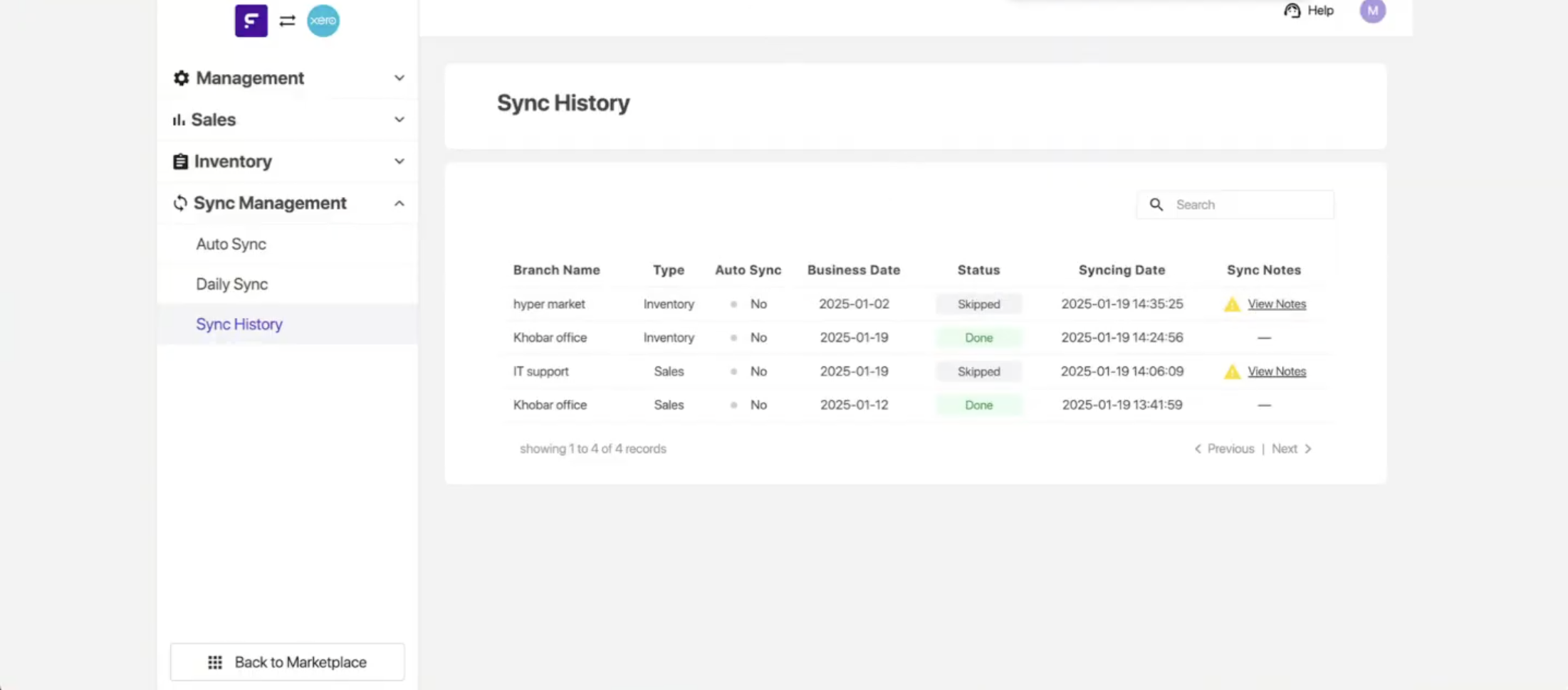 يتيح لك رؤية عمليات المزامنة السابقة التي قمت بها، وقتها، نوعها، حالتها، والفرع الذي تمت مزامنته.