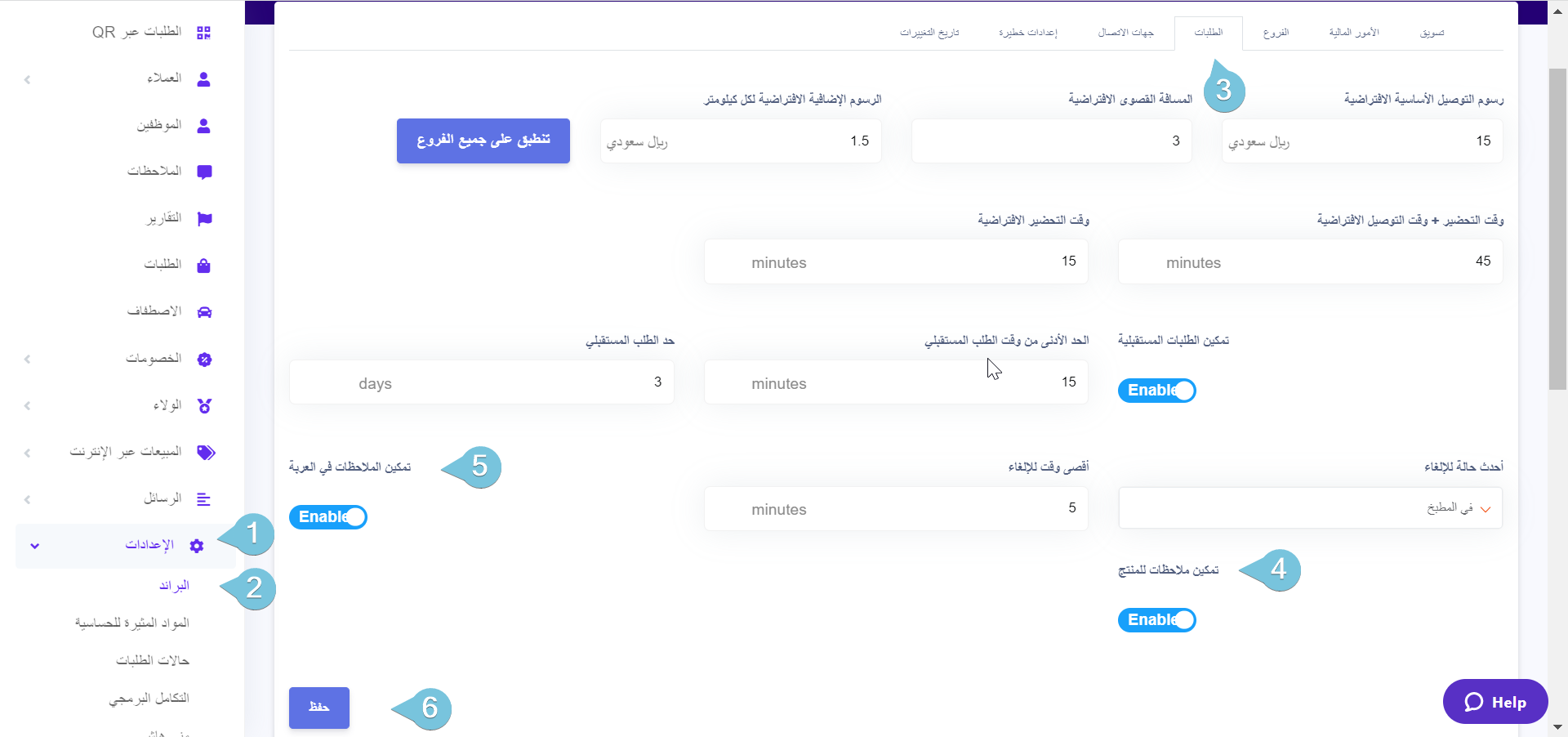 مقالات ذات صلة مهلة الانتظار للمنتجات في عربة التسوق إعدادات الفاتورة استخدام الفروع كيفية مزامنة المستخدمين إنشاء طلب مركز اتصال جديد مقالات مرقاة الدليل المتكامل لتقارير الكونسول الدليل المتكامل للقائمة و المنتجات الدليل المتكامل للمخزون الدليل المتكامل لإعدادات الكونسول و النظام الملاحظات على المنتجات و العربة 9 ابريل، 2023 21:38 محدَّث من لوحة تحكم لفودكس اونلاين > الإعدادات > البراند > الطلبات 1- إضغط الإعدادات 2- إضغط البراند 3- إضغط الطلبات 4- إضغط تمكين ملاحظات للمنتج 5- إضغط تمكين الملاحظات في العربة 6- إضغط حفظ السابق التالي 8226115254812