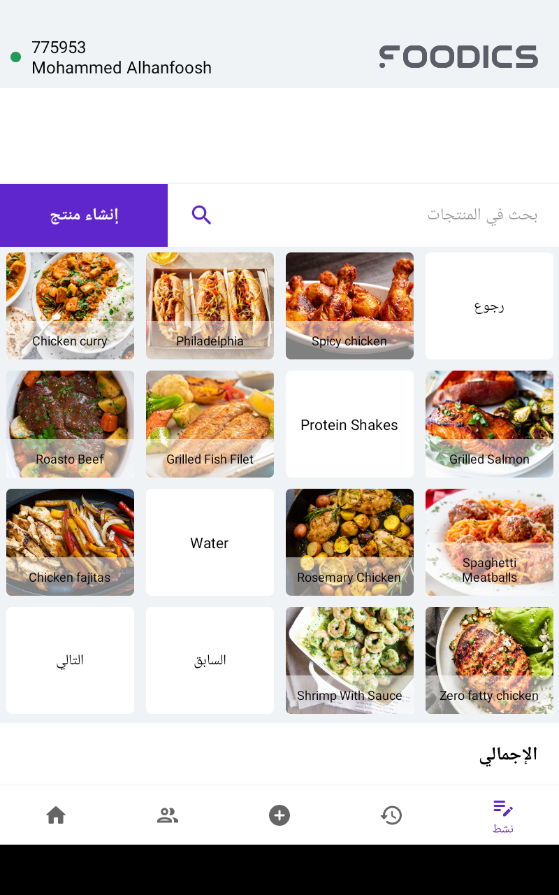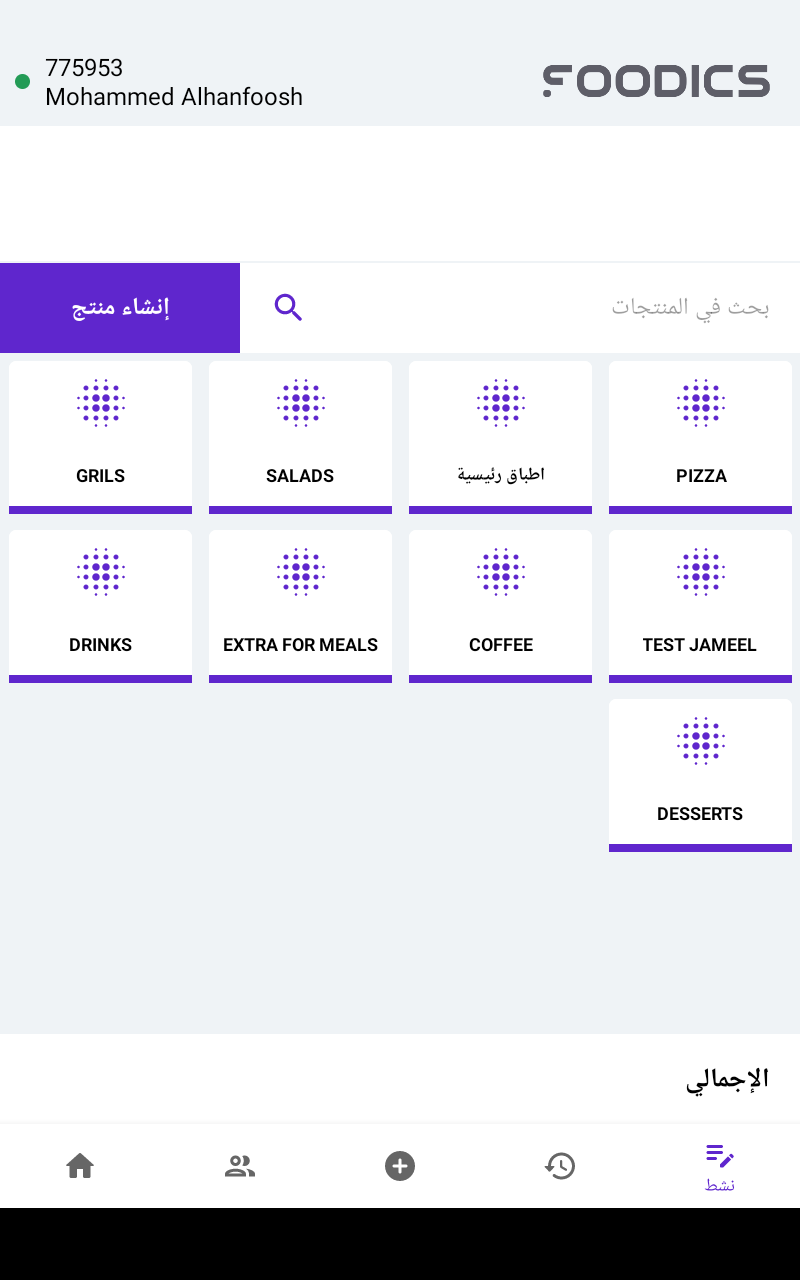 الدخول للمحاسبة في فودكس ون سيؤدي إلى عرض قائمة المنتجات لبدء أخذ الطلبات. سوف تعرض لك القائمة في البداية التصنيفات التي يمكنك الضغط عليها للوصول إلى المنتجات ذات الصلة بالتصنيف الذي حددته.