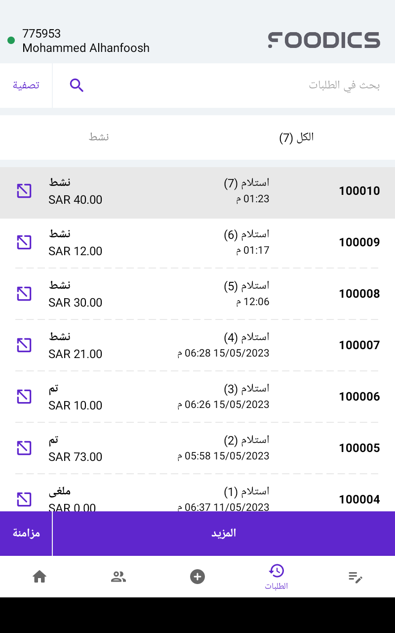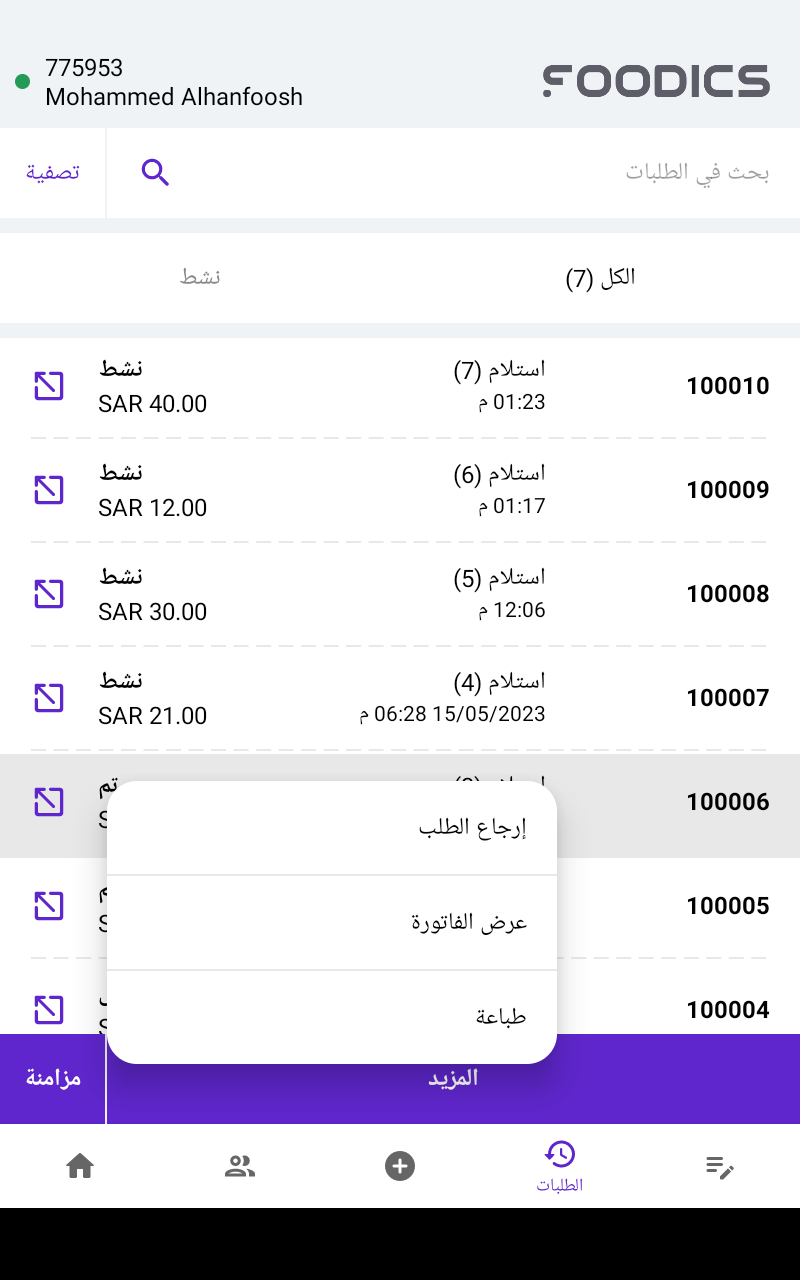 لعرض جميع الطلبات المستلمة على فودكس ون، اضغط على أيقونة الطلبات المتواجدة في أسفل الشاشة ثاني أيقونة من اليمين