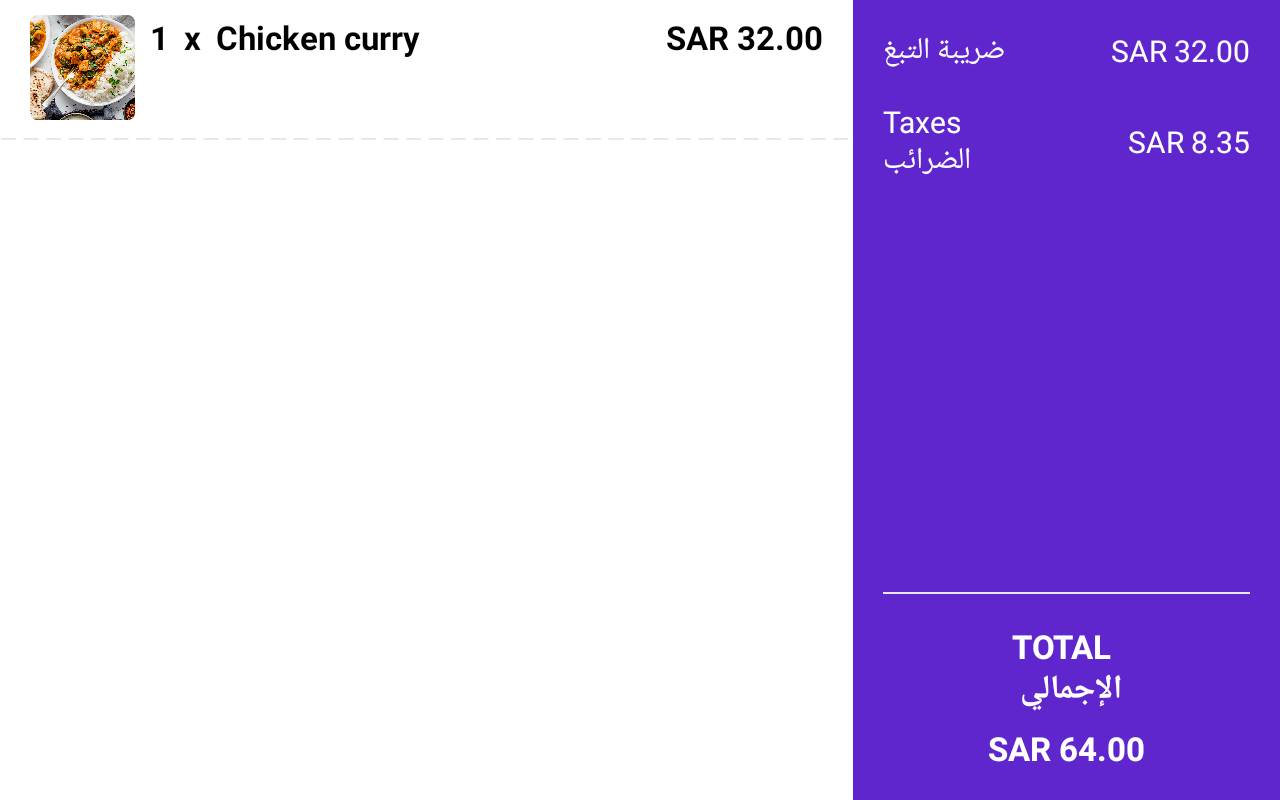 2. ستنعكس معلومات الطلب على شاشة عارض الطلبات مباشرة بما في ذلك اسم وسعر المنتج، وقيمة الضريبة والسعر الإجمالي.
