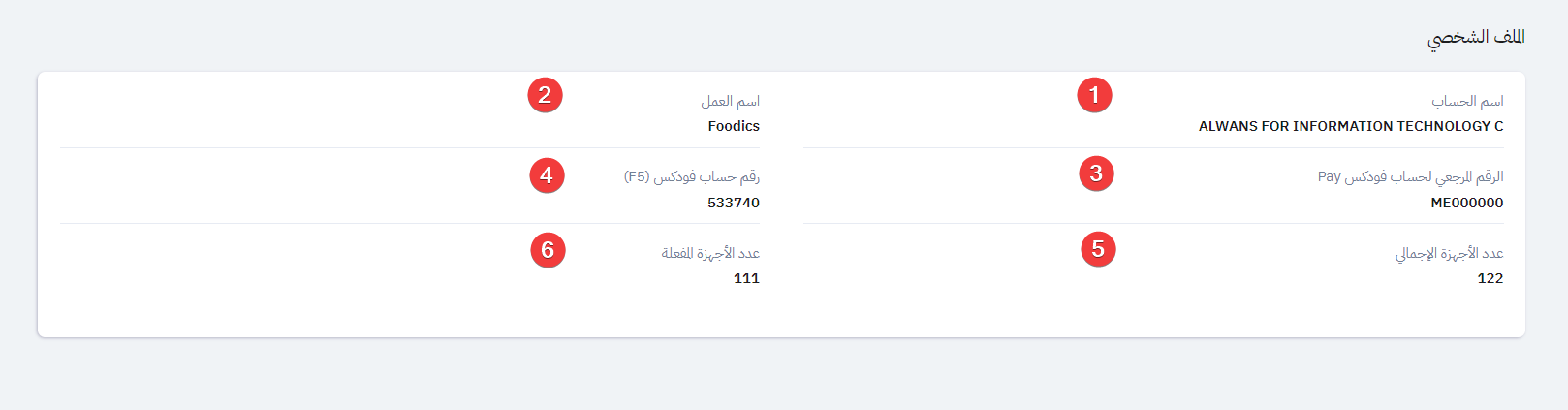 - رقم حساب فودكس (F5): يوضح رقم الحساب المتعلق بالمؤسسة الخاصة بك والذي يتم تزويده إليك من قبل شركة فودكس في حال تم الاشتراك في الخدمات التي تزودها فودكس " مثال: نظام الكاشير، فودكس اونلاين، إلخ.. "