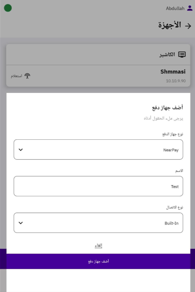 6- اختر "NearPay" في خانة نوع جهاز الدفع، ثم أضف الاسم، واضغط على "إضافة جهاز دفع".