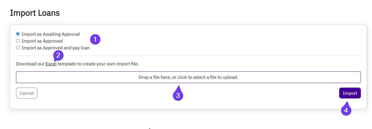 - You can also upload via the Import Loans feature (explained next)