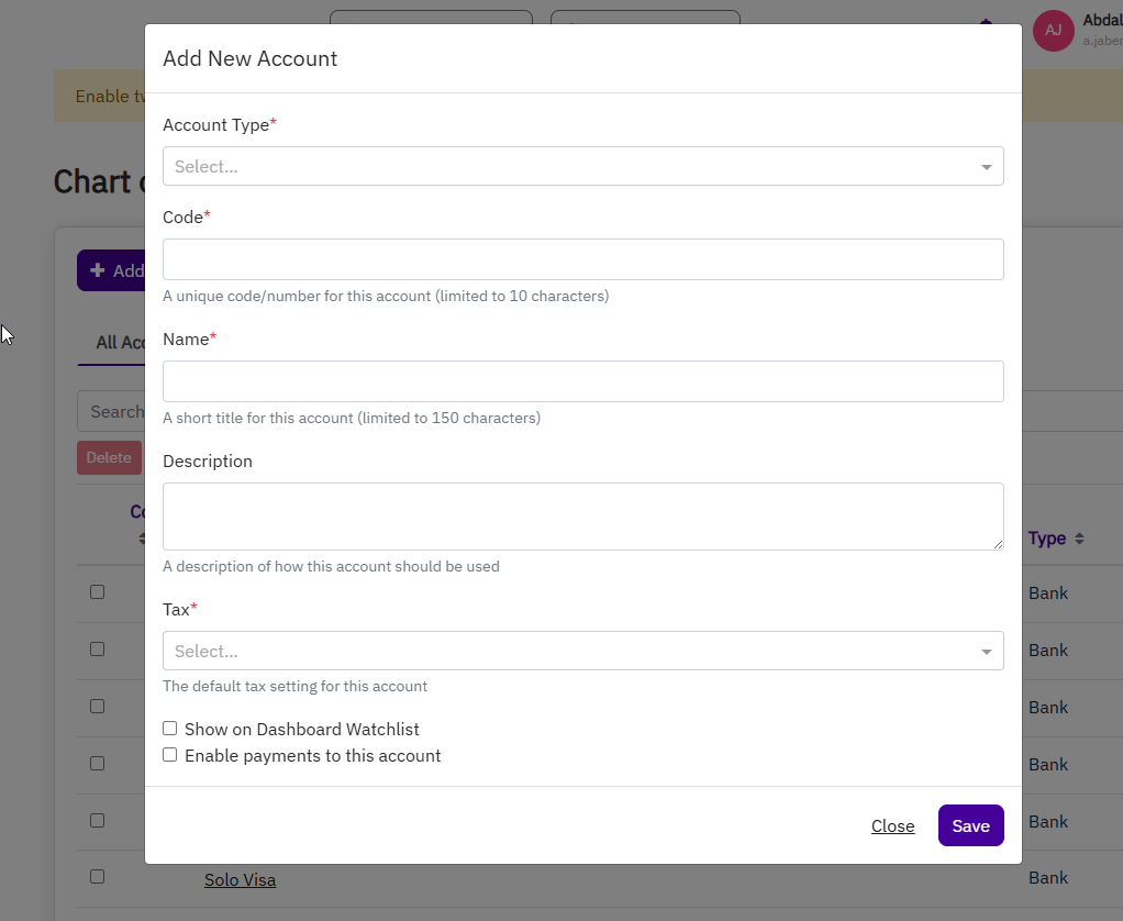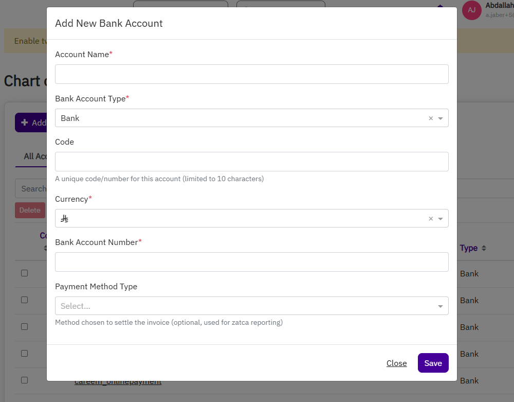 After adding and saving banks and payment methods, they will be visible under Bank Accounts.