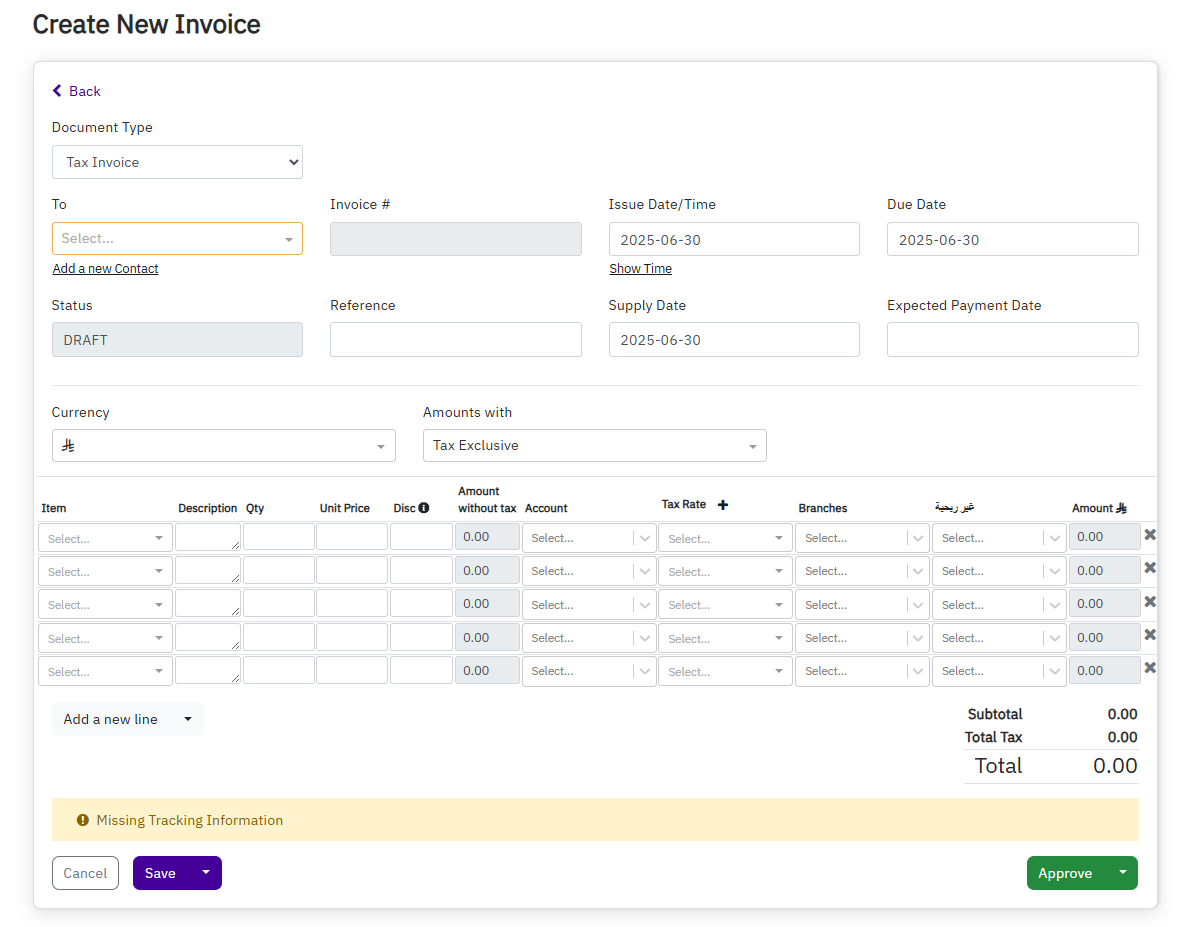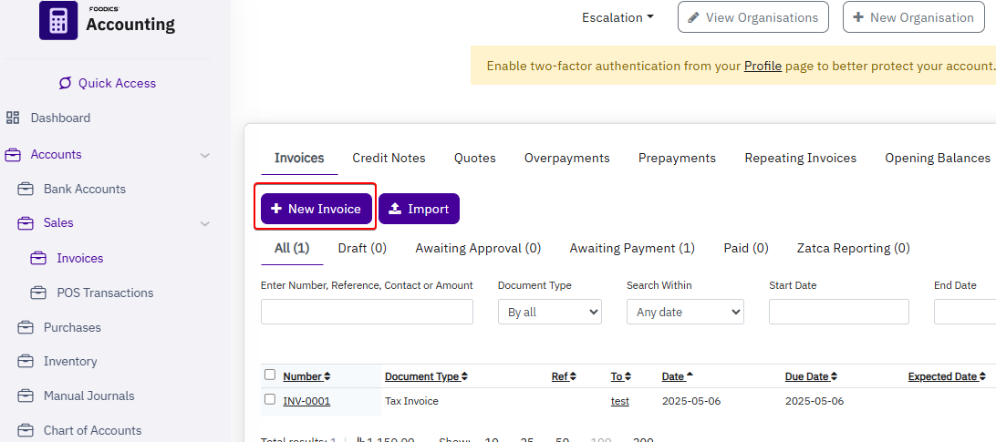 - Go to Accounts > Invoice > New Invoice.