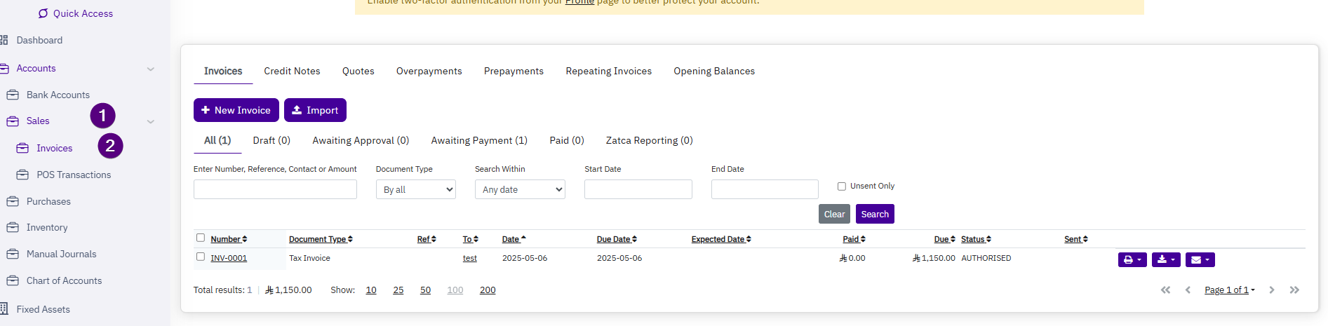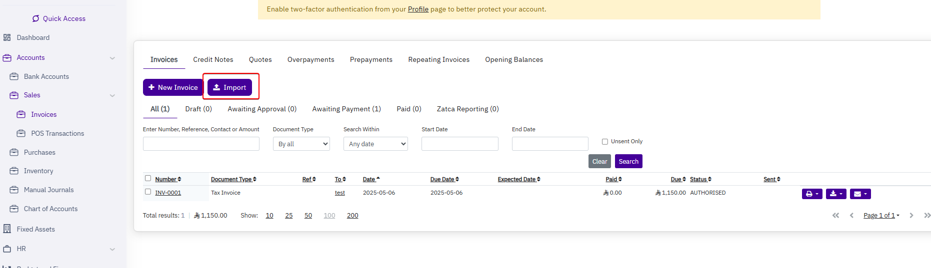 - Go to Sales > Sales Invoices > Import